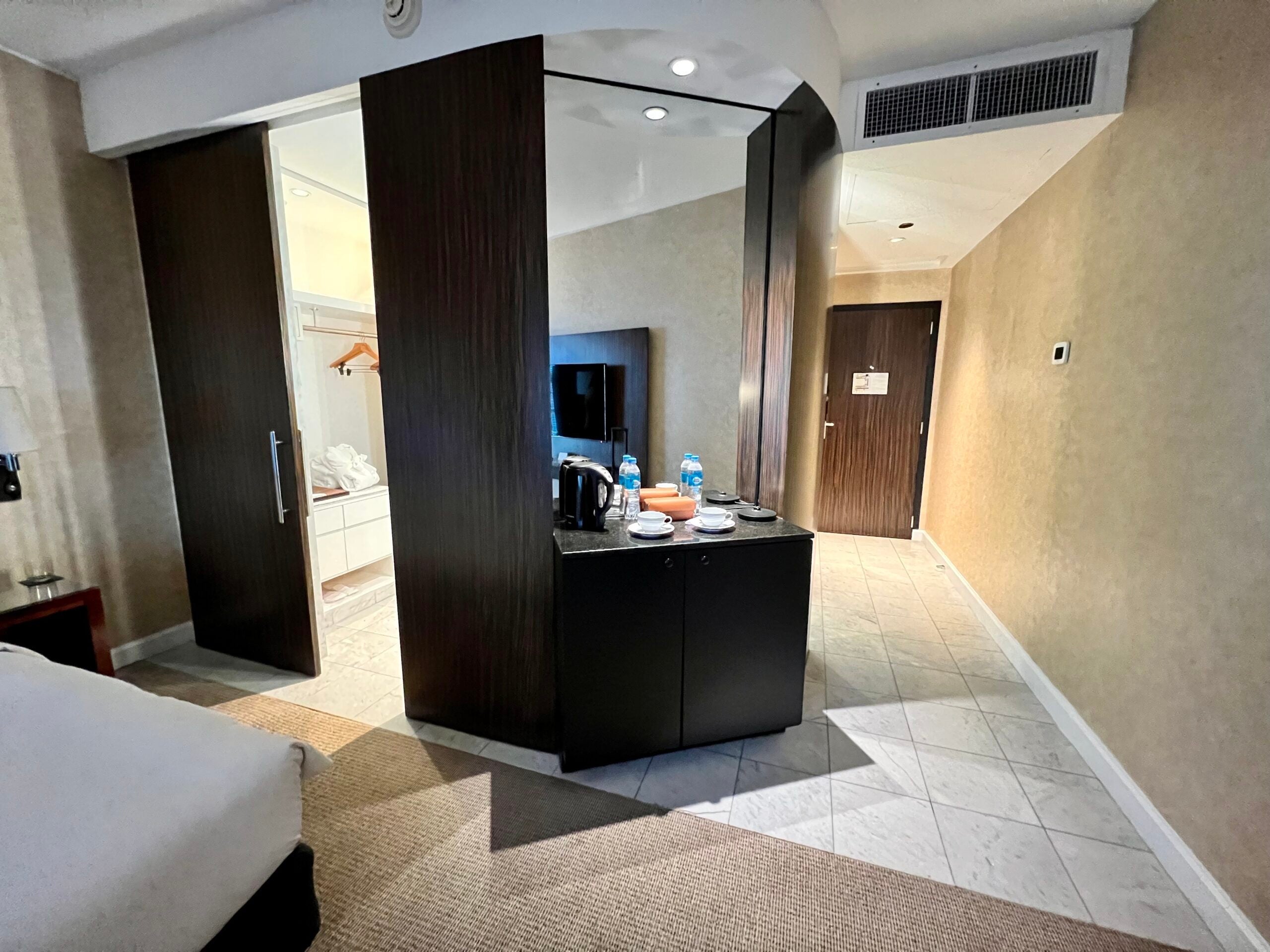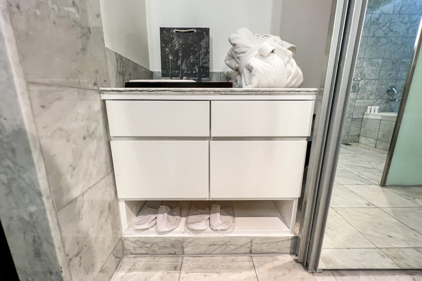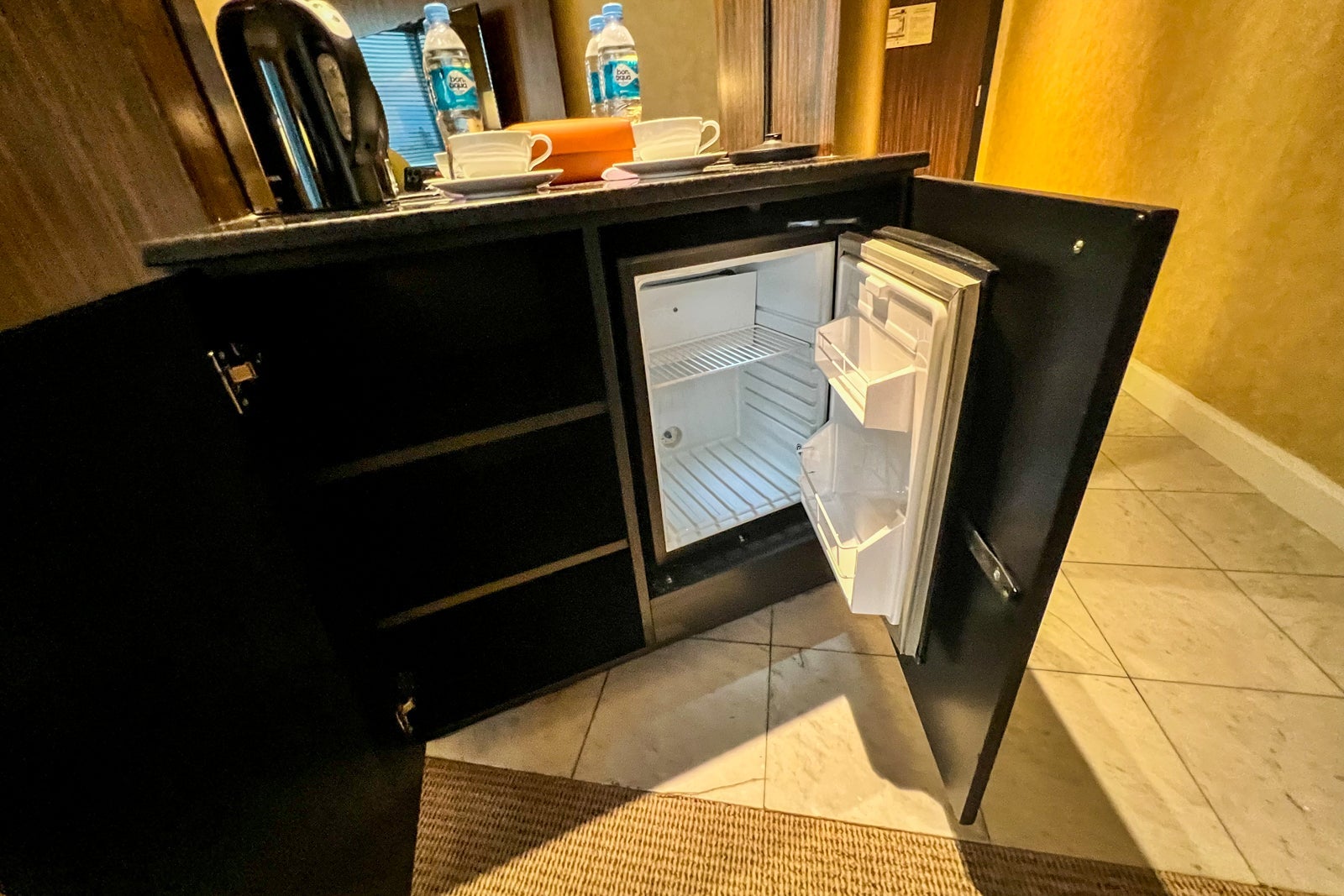 Further down the entry hall, a small cabinet held a hidden minifridge and a few other lackluster amenities, including small, complimentary water bottles along with instant coffee and tea packets. The lack of other snacks and drinks made this feel more like a budget motel than a Park Hyatt.