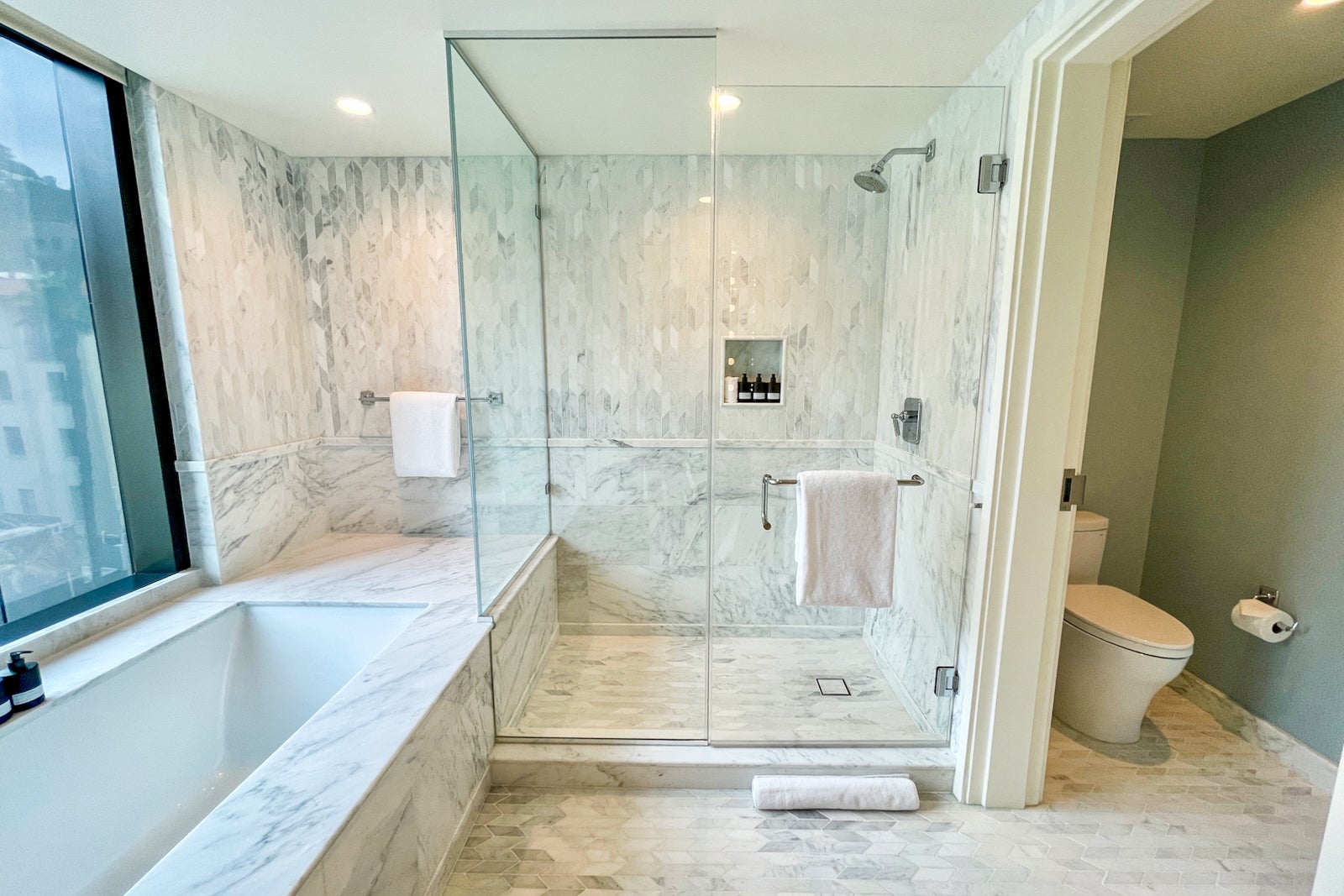 But my favorite part was the deep soaking tub, which offered views of the Hollywood Hills and came stocked with Lola's Apothecary bath salts. The stand-up shower was spacious and I was a big fan of the Min New York toiletries, which came in large-format bottles.