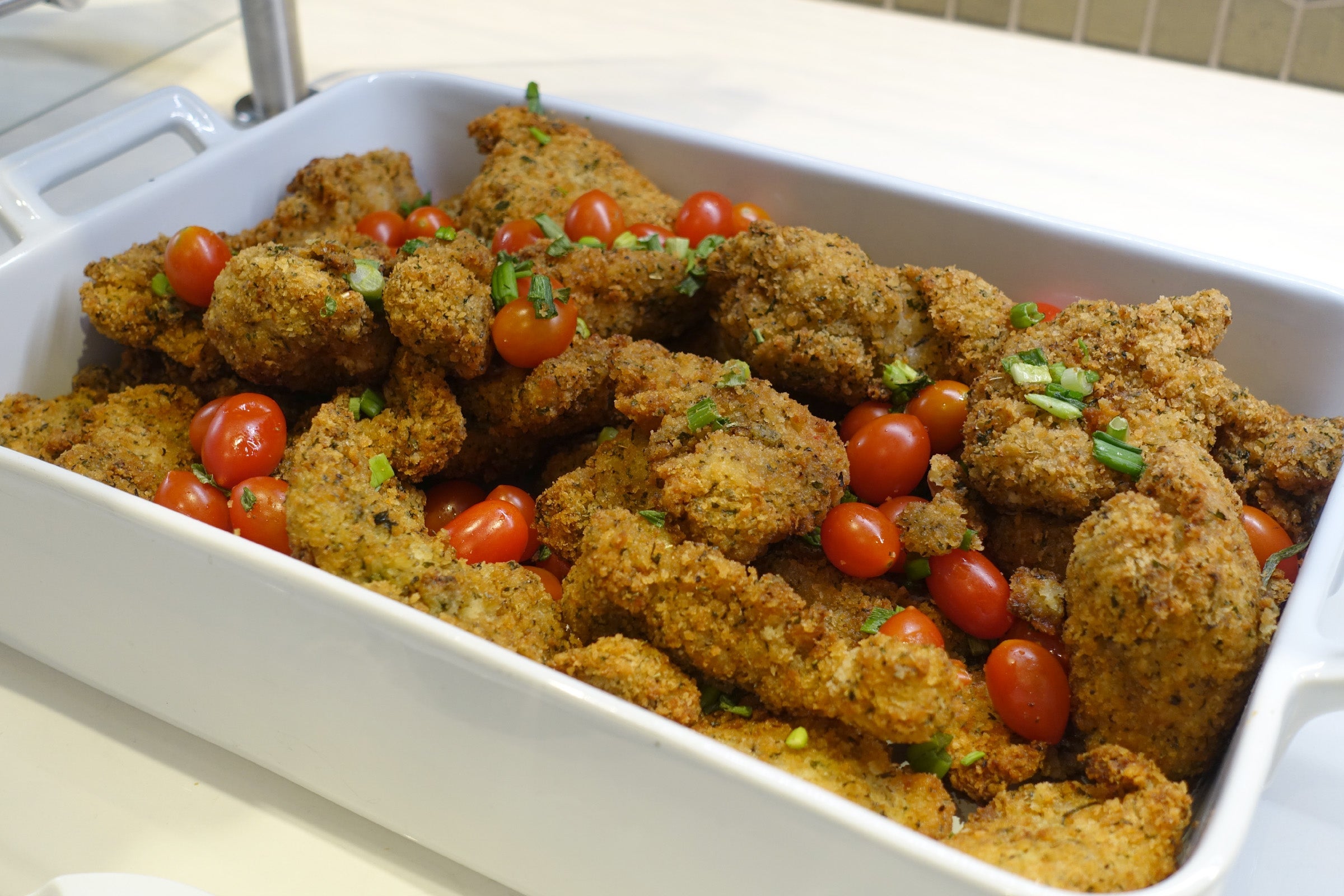 There are also a few hot entrees, such as the fried chicken with tomatoes pictured here.