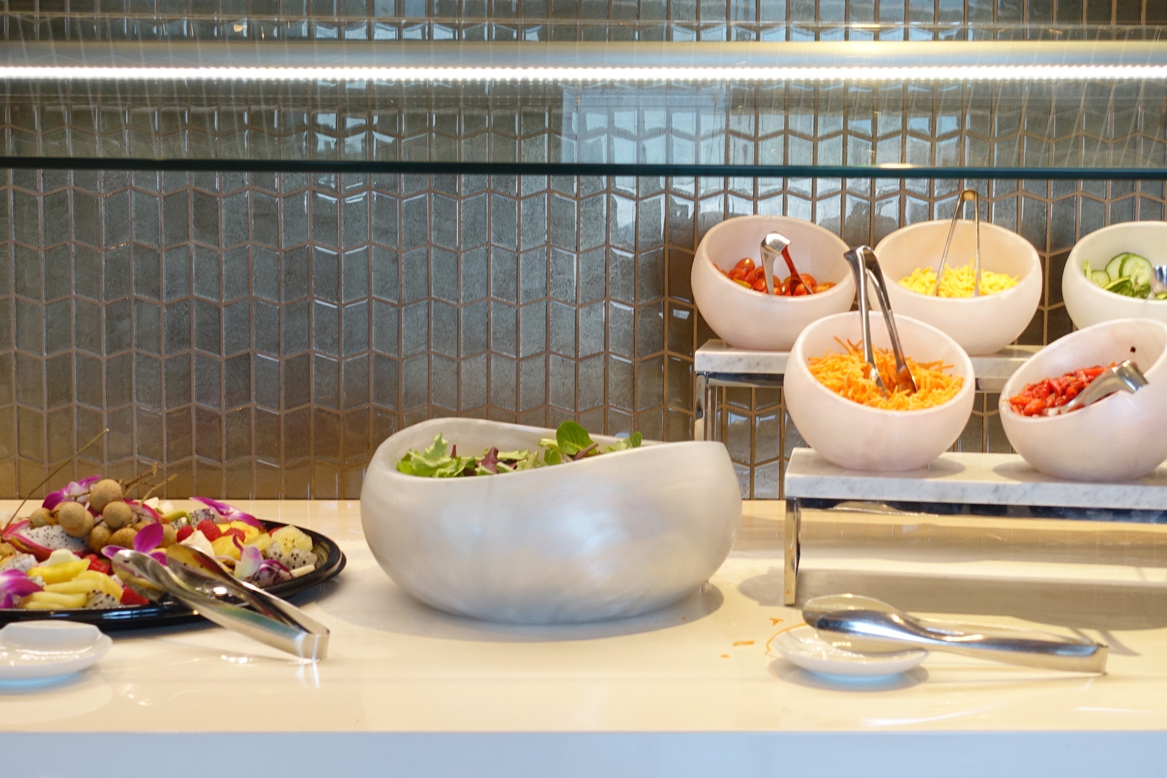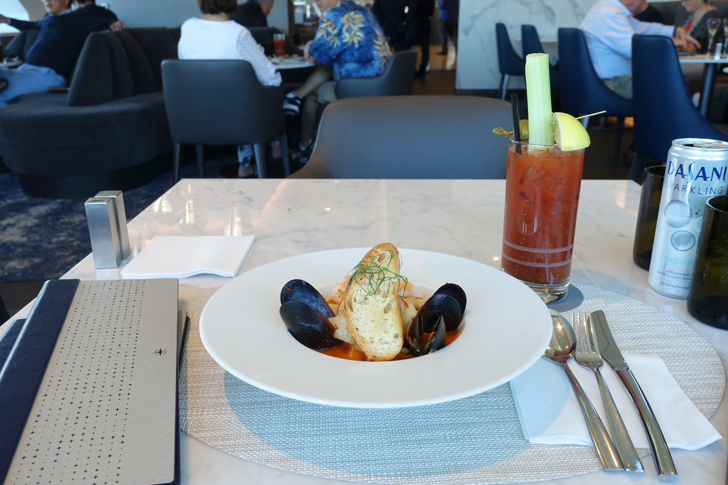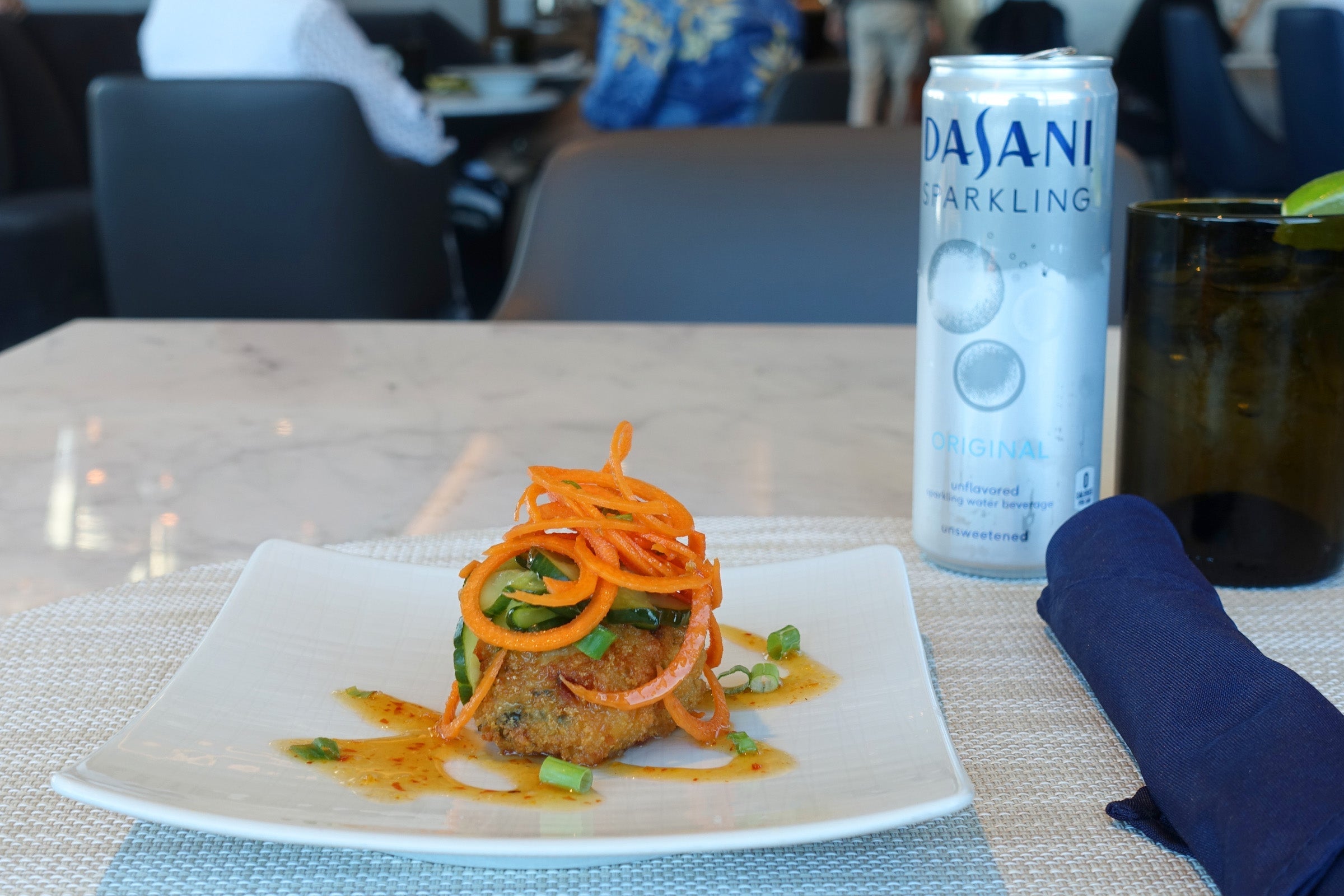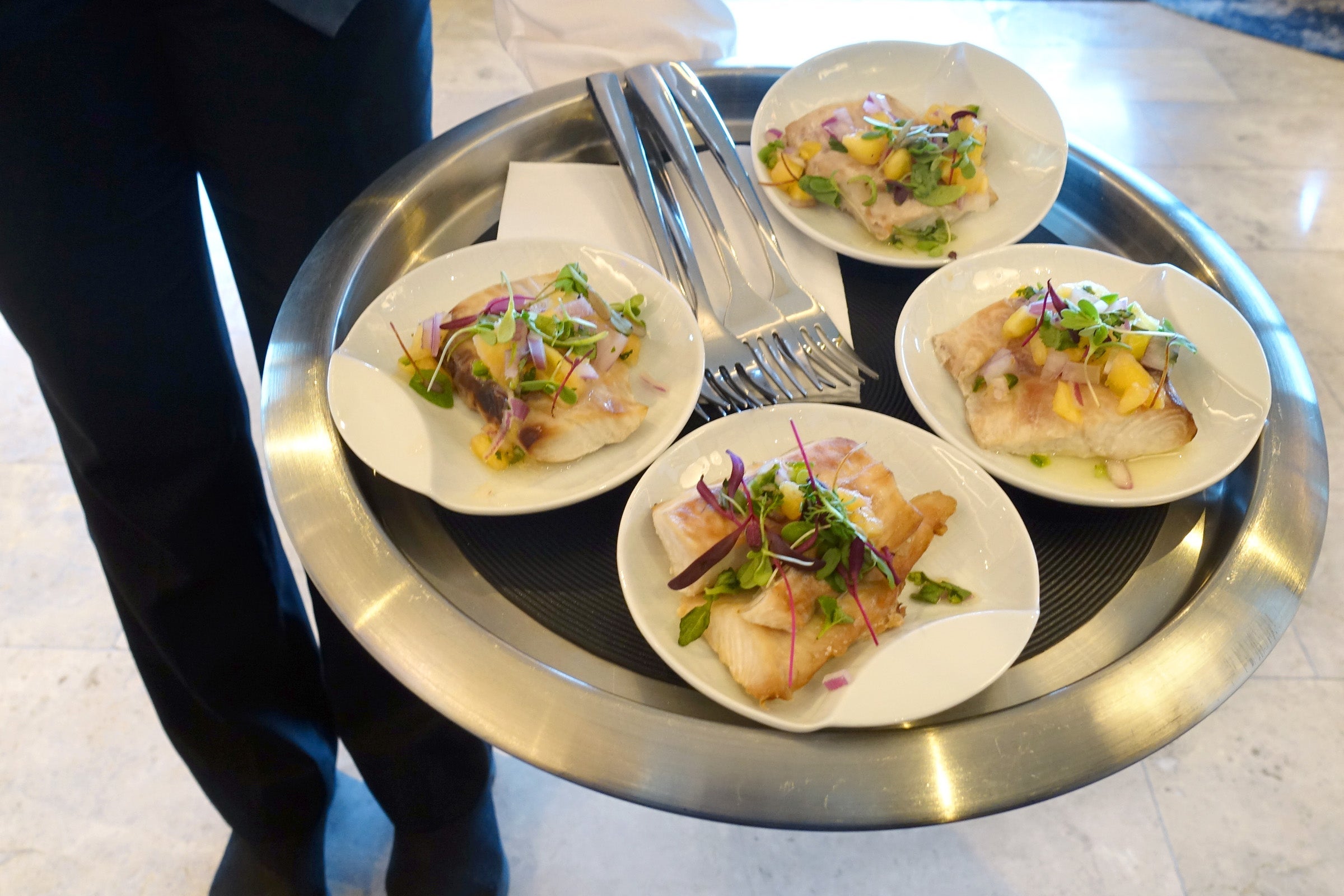 Servers wander the lounge with passed items as well — within a minute of sitting down I was offered a small plate of mahi mahi with chunks of mango on top. They certainly make it difficult to save your appetite for the flight.