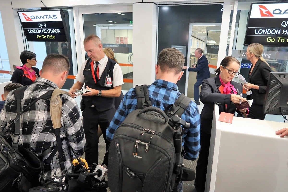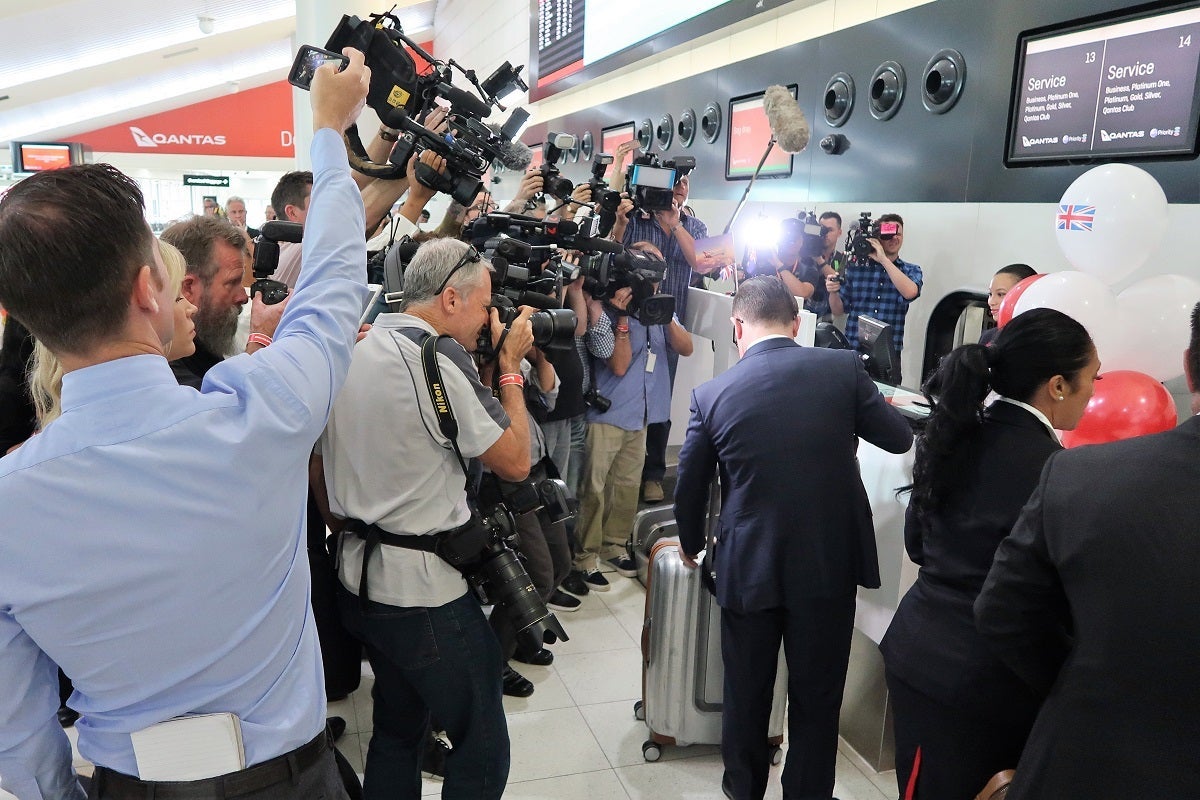 The check-in desk was festive and lively, with dozens of photographers and videographers on hand to record and interview passengers, including Qantas CEO Joyce: