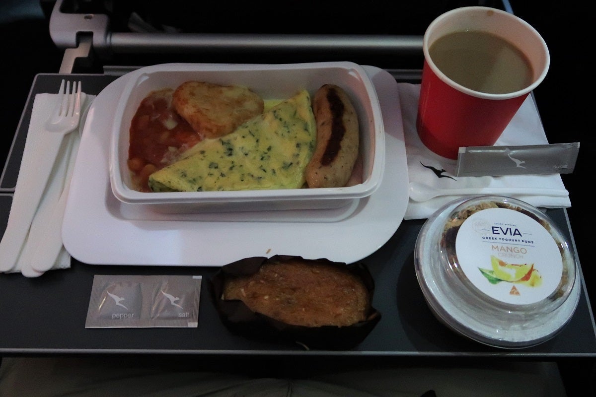 In fairness for serving dinner front-to-back, the cabin crew served breakfast from back to front. Choices were "Feta and spinach omelette with pork and apple sausage, bacon, hash brown and braised beans" or "Seasonal fruit plate." I chose the omelette. It was served with a fruit and granola Greek yogurt and a "coconut banana loaf" (the last of which I didn't try). The meal seemed rather bland, but it may have just been that my taste buds were shot as we neared the end of the long flight.