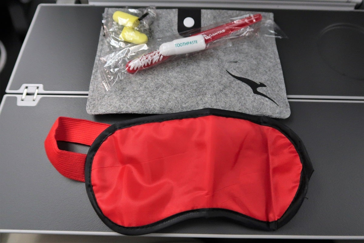 During ascent, the cabin crew passed through the cabin a couple of times to hand out menus and amenity kits. Inside the cloth-backed amenity kit is a bright red mask, earplugs, toothbrush and a small tube of toothpaste.