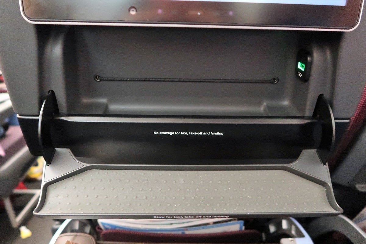 The seat backs have a very useful 11.5 inch x 2 inch openable tray. Inside, there's an elastic band that I found helpful for holding my boarding pass, menu, landing card and even the amenity kit. The rest of the tray was helpful for storing my compact camera and cell phone in one easy-to-access place. The tray also has a USB power plug that's useful for plugging in your phone during the flight. While it's not a fast-charging plug, your airplane-mode phone will surely be full by the time the 17-hour flight lands.