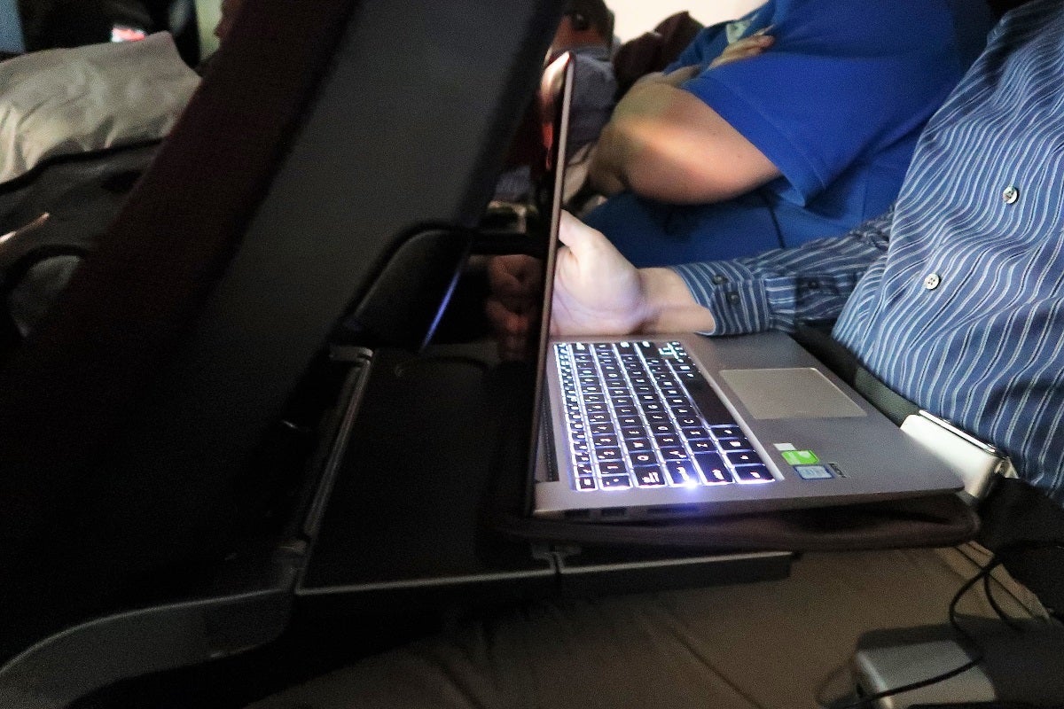 Speaking of seat recline, it's a mixed bag. The seats do recline a full six inches. This is great if you're trying to go to sleep. But, it means that you can't work on your laptop if the passenger in front of you reclines — as he did for almost this entire flight.
