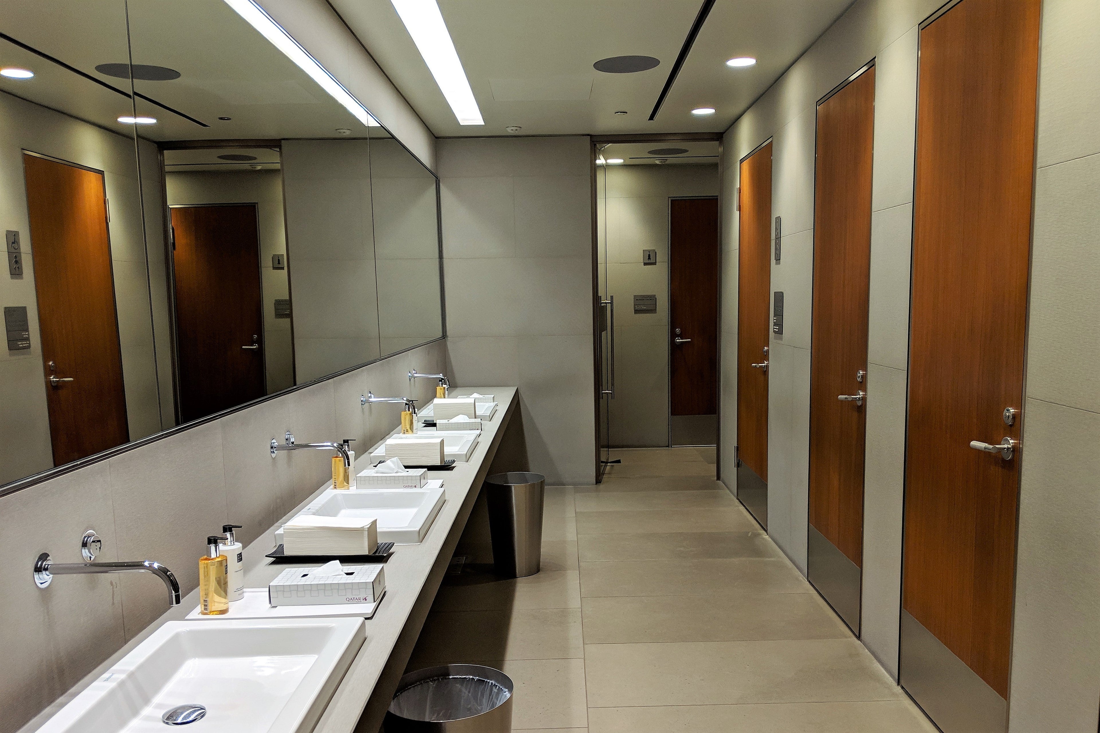 There are four toilet stalls in the women's bathroom, one of which is handicap accessible and has a baby-changing table. There's lotion and hand soap next to each sink.