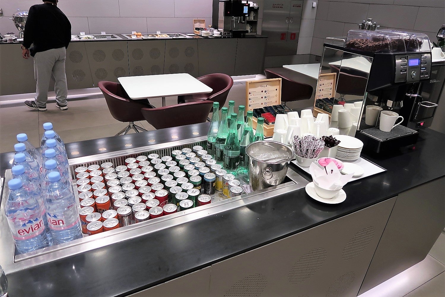 There was no alcohol visible in the lounge, nor any signs about obtaining alcohol. The only sign of alcohol was a stash of wine glasses at one end of the food buffet. You can ask a lounge attendant for red wine, white wine or beer and they'll obtain your selection from a back room. Otherwise, the drink selection is limited to juice, sodas, water, tea and coffee.