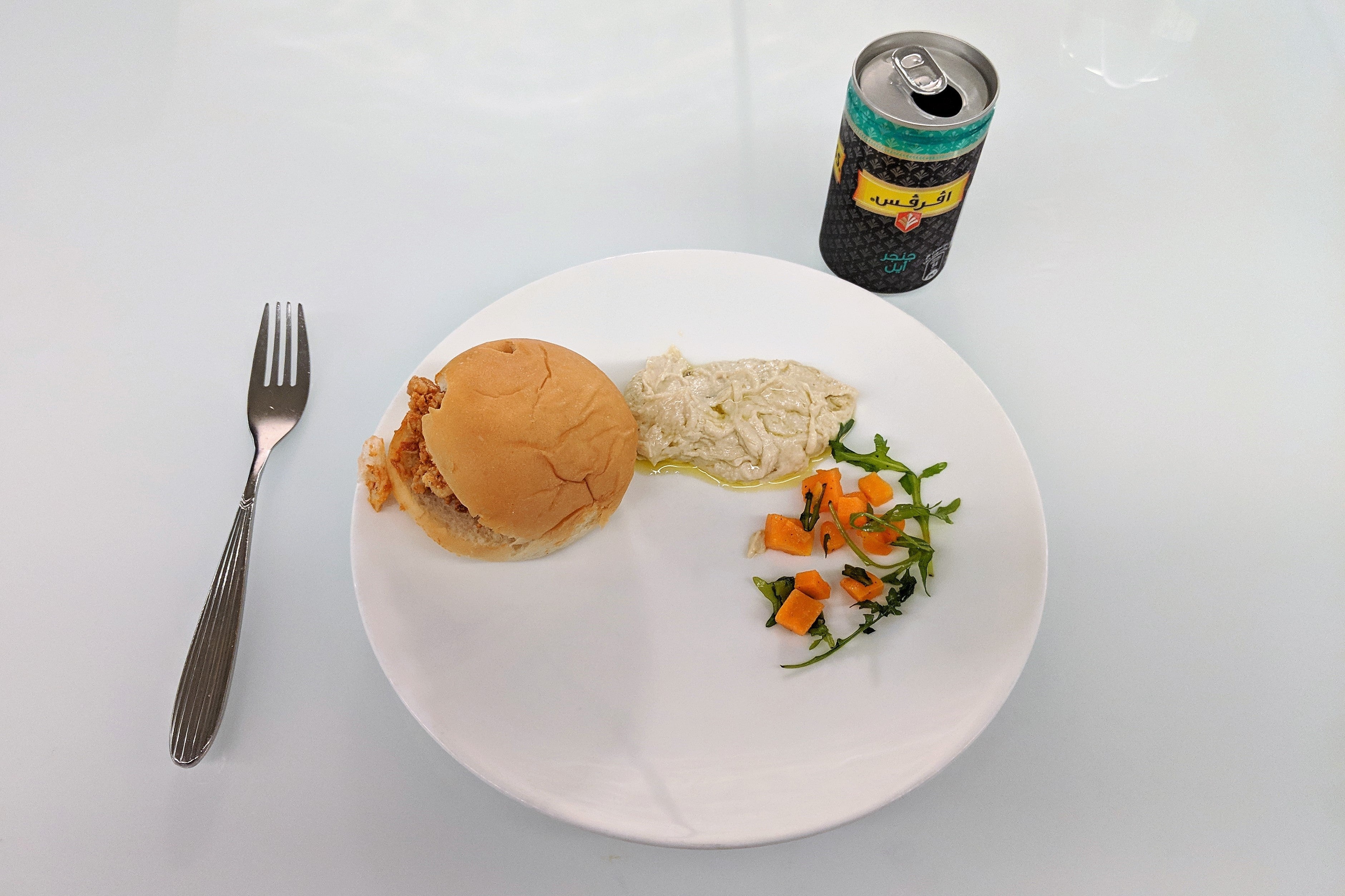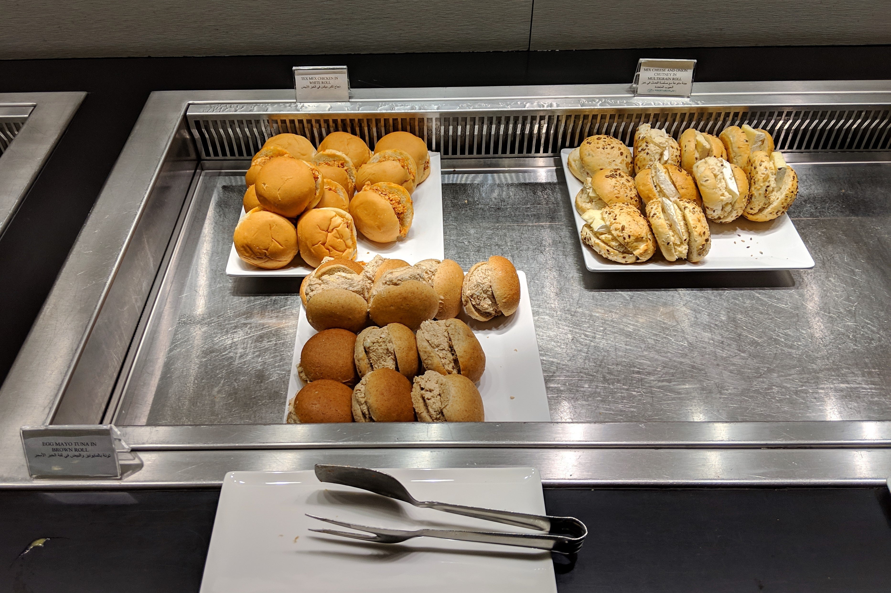 The only hot food available in the lounge consisted of two types of soups: laksa and tomato basil. On a cold buffet, four types of sandwiches and six types of salads were available. Muffins, small pastries, apple juice and orange juice were available at a square table near the dining area.