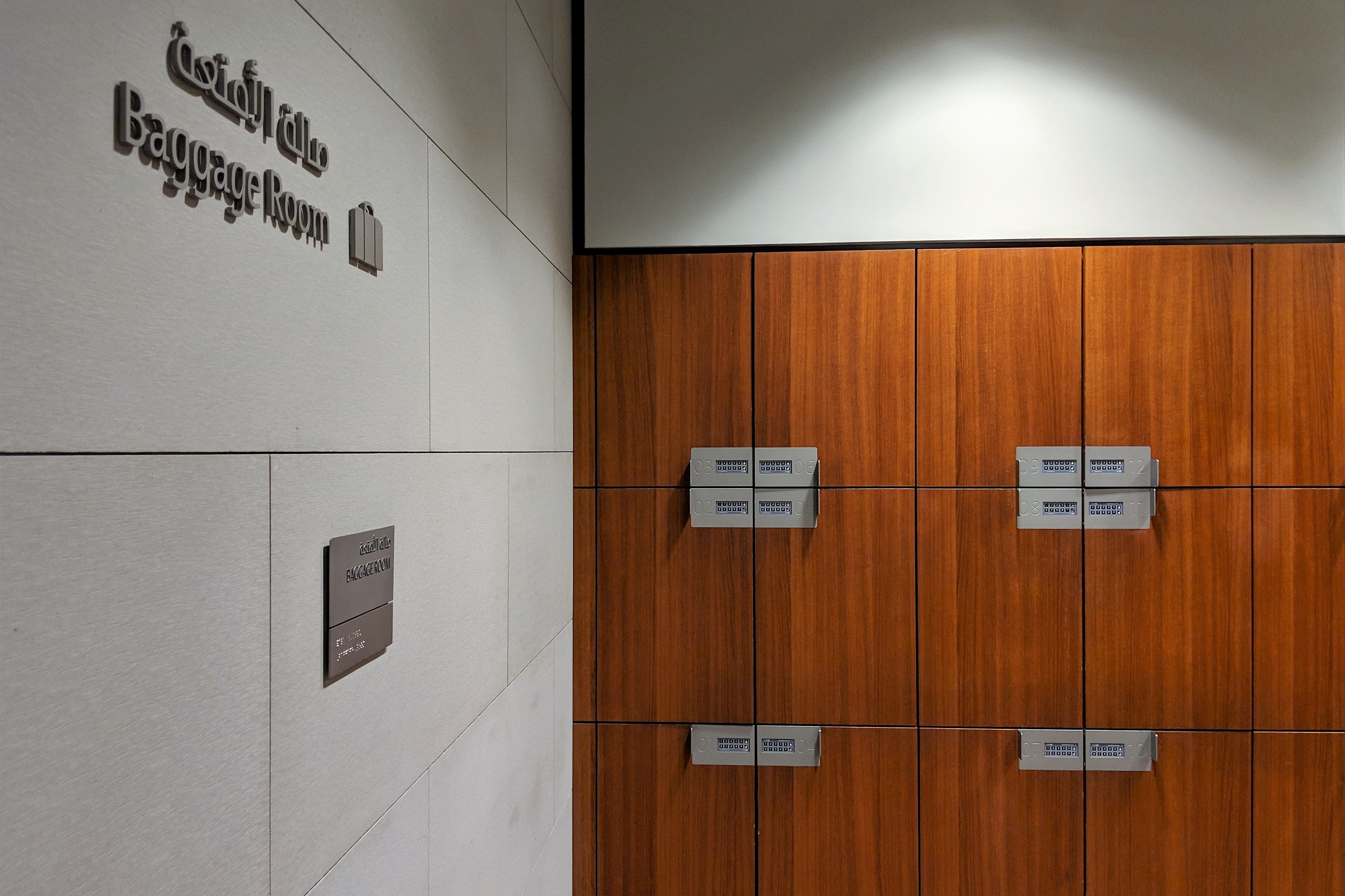 To the right, near the lounge entrance, is a hallway leading to restrooms and a luggage storage area.
