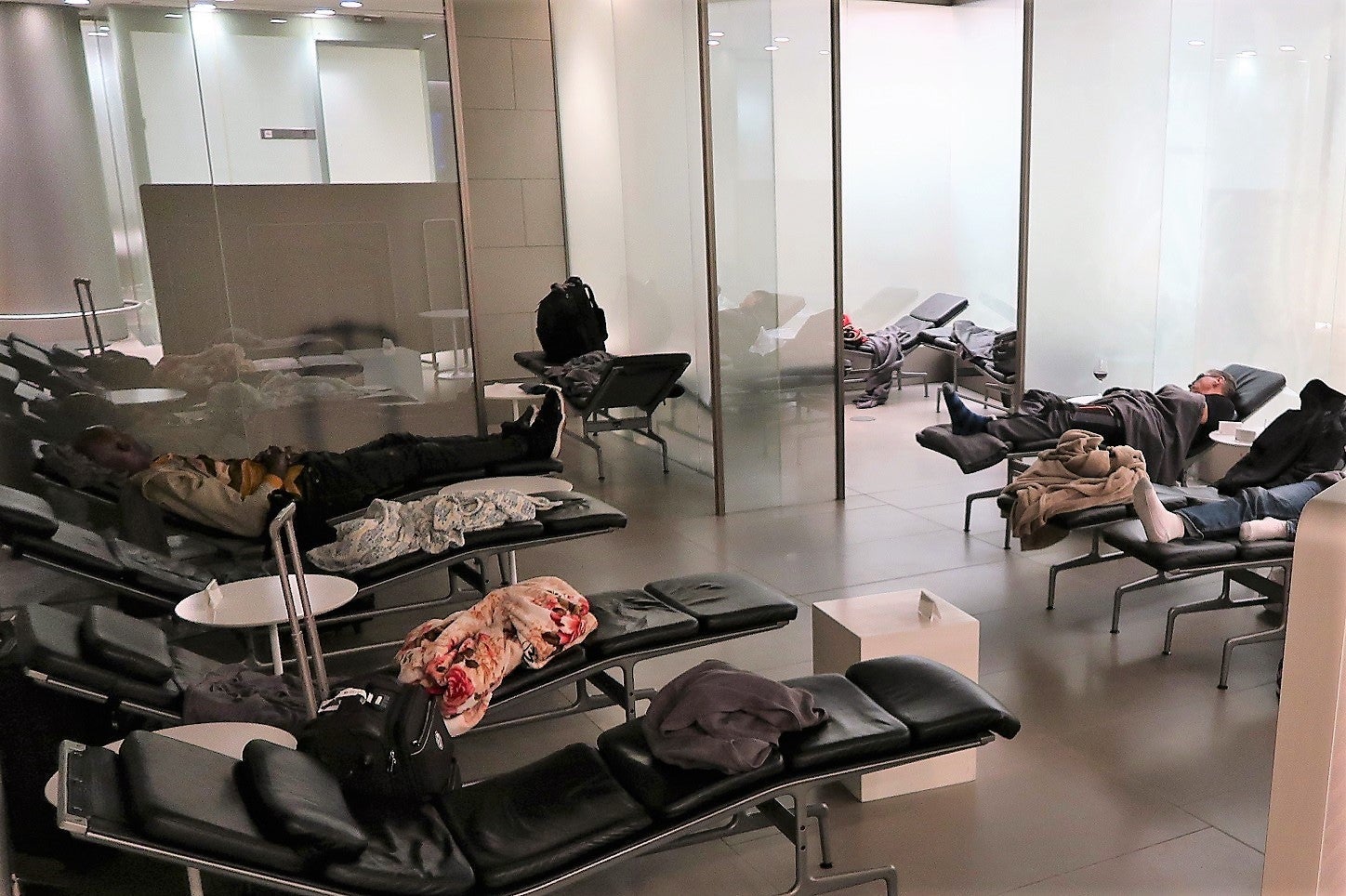 Farther back in the lounge, there's a sleeping room off to the right with about 12 lounge chairs. When I visited around 10pm, the room was full of sleeping passengers and their belongings.