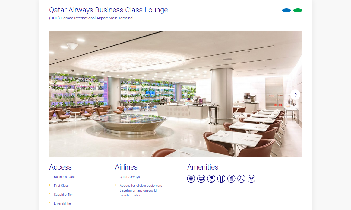 Qatar Airways likes to skirt the rules when it comes to lounge access. Oneworld regulations state that Oneworld Sapphire elites are "welcome in Business Class or frequent flyer lounges," but Qatar avoids this rule by having a separate business class lounge for Oneworld Sapphire elites.