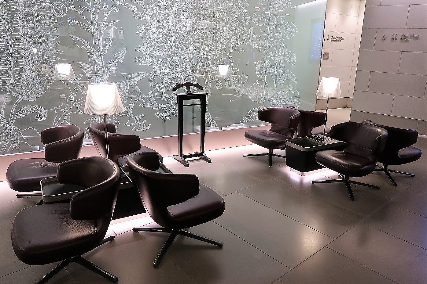 The Business Class Lounge is long and thin, with glass windows on one side of the lounge overlooking the main airside atrium with the teddy bear.