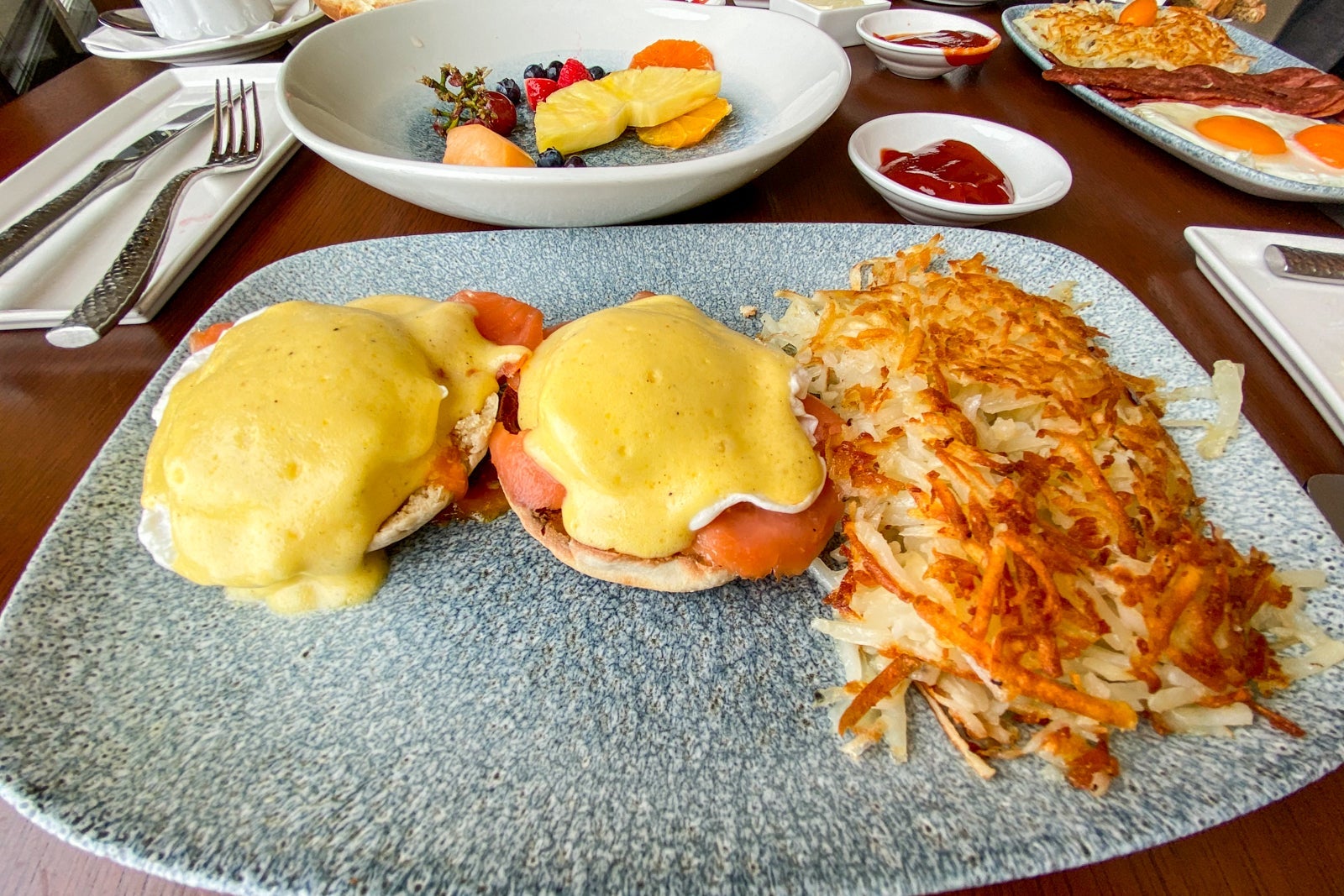 I ordered the eggs Benedict while my parents had eggs with turkey bacon (major kudos on that, since most hotel restaurants do not offer turkey bacon). We also ordered juice and a bowl of shared fruit. The total came to around $150. I charged it to my room and used the annual up to $300 statement credit for eligible purchases at hotels participating in the Marriott Bonvoy program from the Marriott Bonvoy Brilliant American Express Card to cover it.