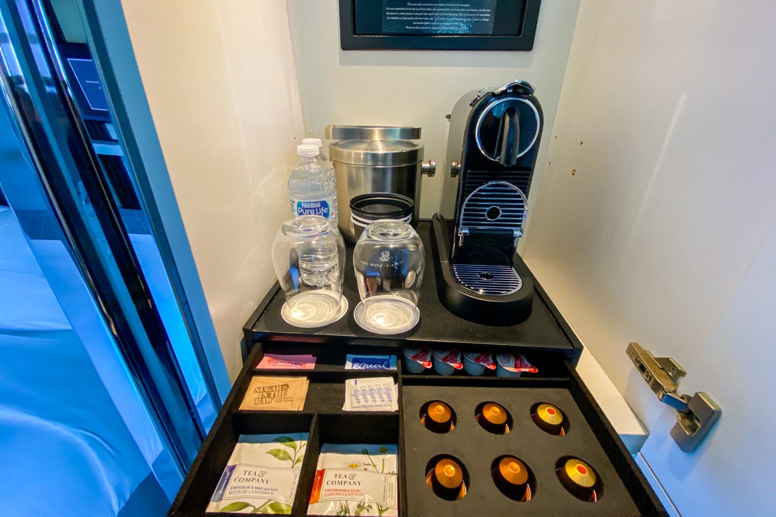 There was another closet unit next to the bed on the far end of the room. Inside was a Nespresso machine with plenty of coffee pods, sugar and tea provisions. Below that was an empty fridge, where we kept the five water bottles that were stocked in the room and replenished upon request.