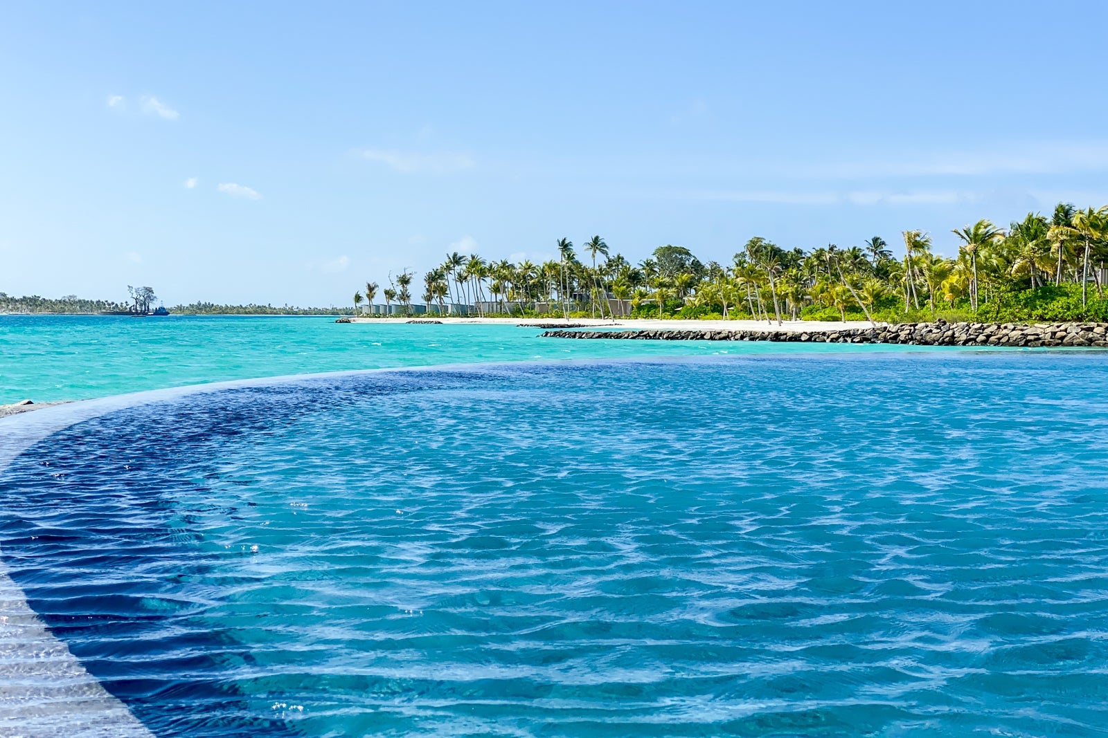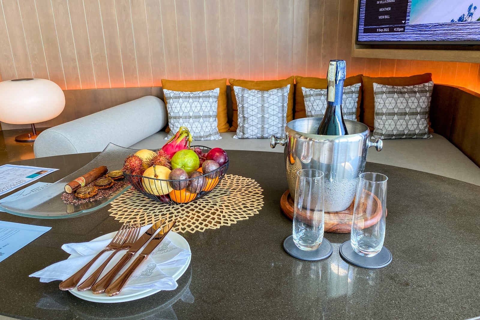 If your villa is on the ocean side, you'll get sunset views, but because you're on open waters, the seas can be a bit more turbulent for swimming purposes. In addition, ocean villas have the other two resorts (Patina and Capella) in their line of sight. While they are still quite a distance away, it does take away from the feeling that you're in the middle of nowhere.