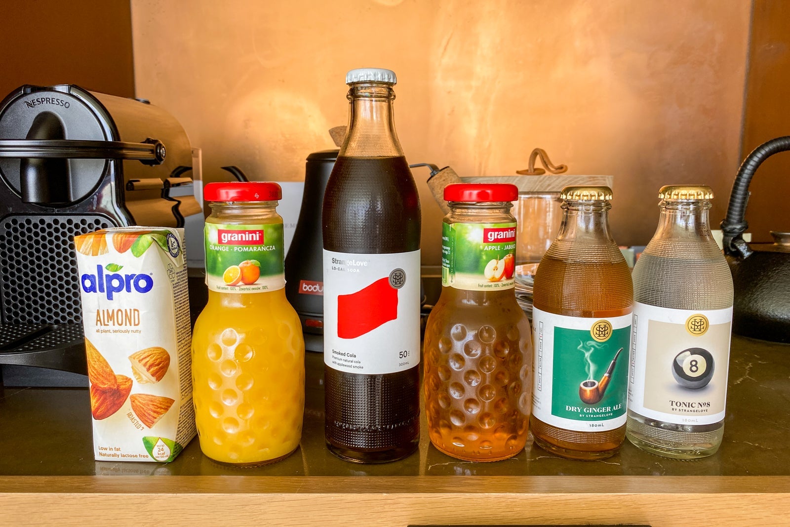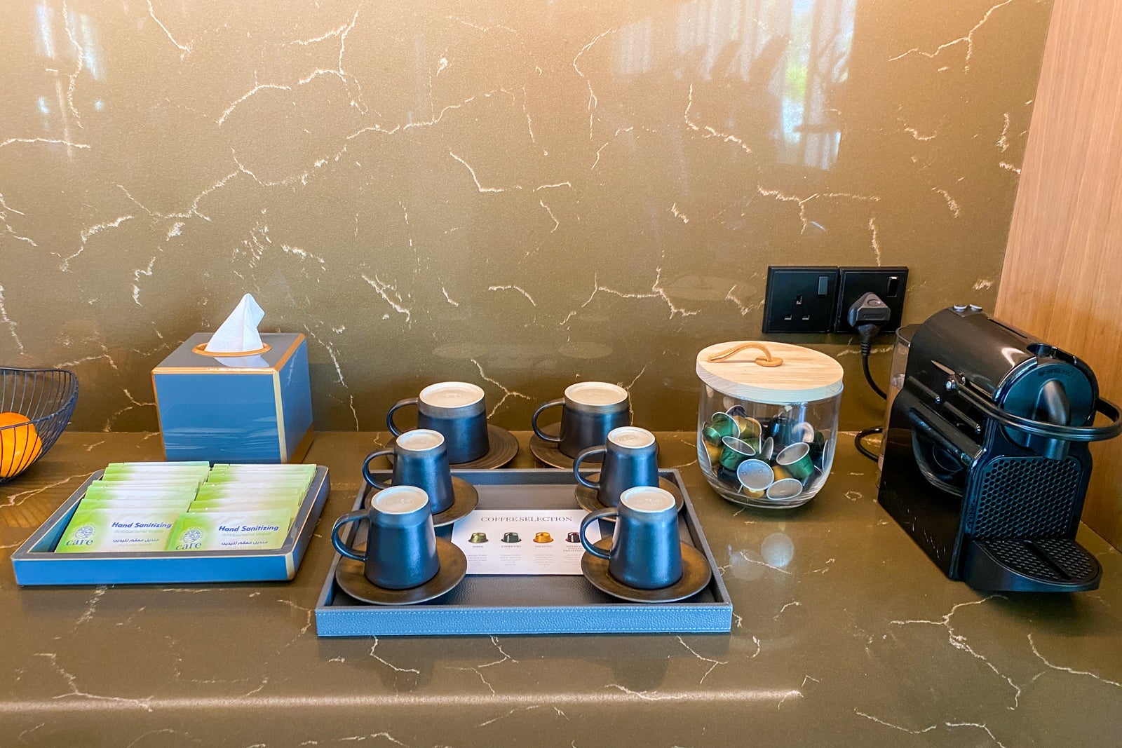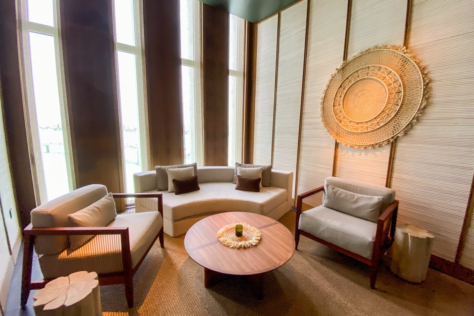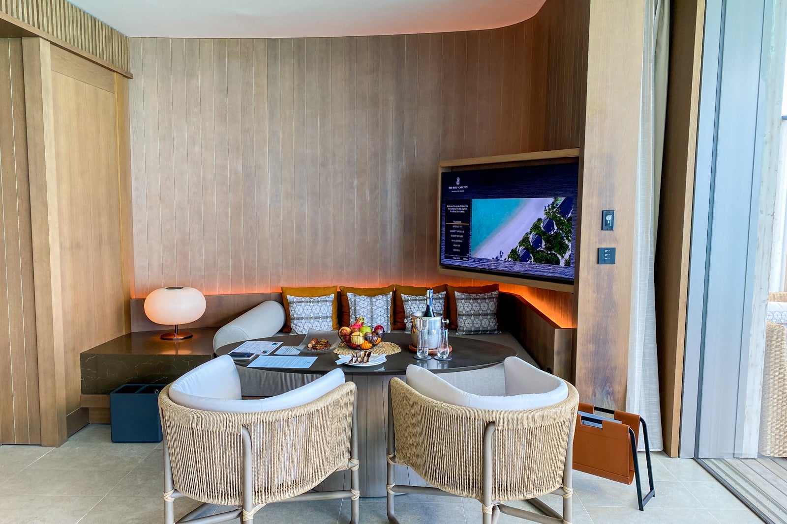 The entryway featured lounge-like seating, a large glass table and a minibar. All nonalcoholic items are complimentary. Any time I needed a refill, I could text my aris meeha. (The grapefruit soda was amazing.)