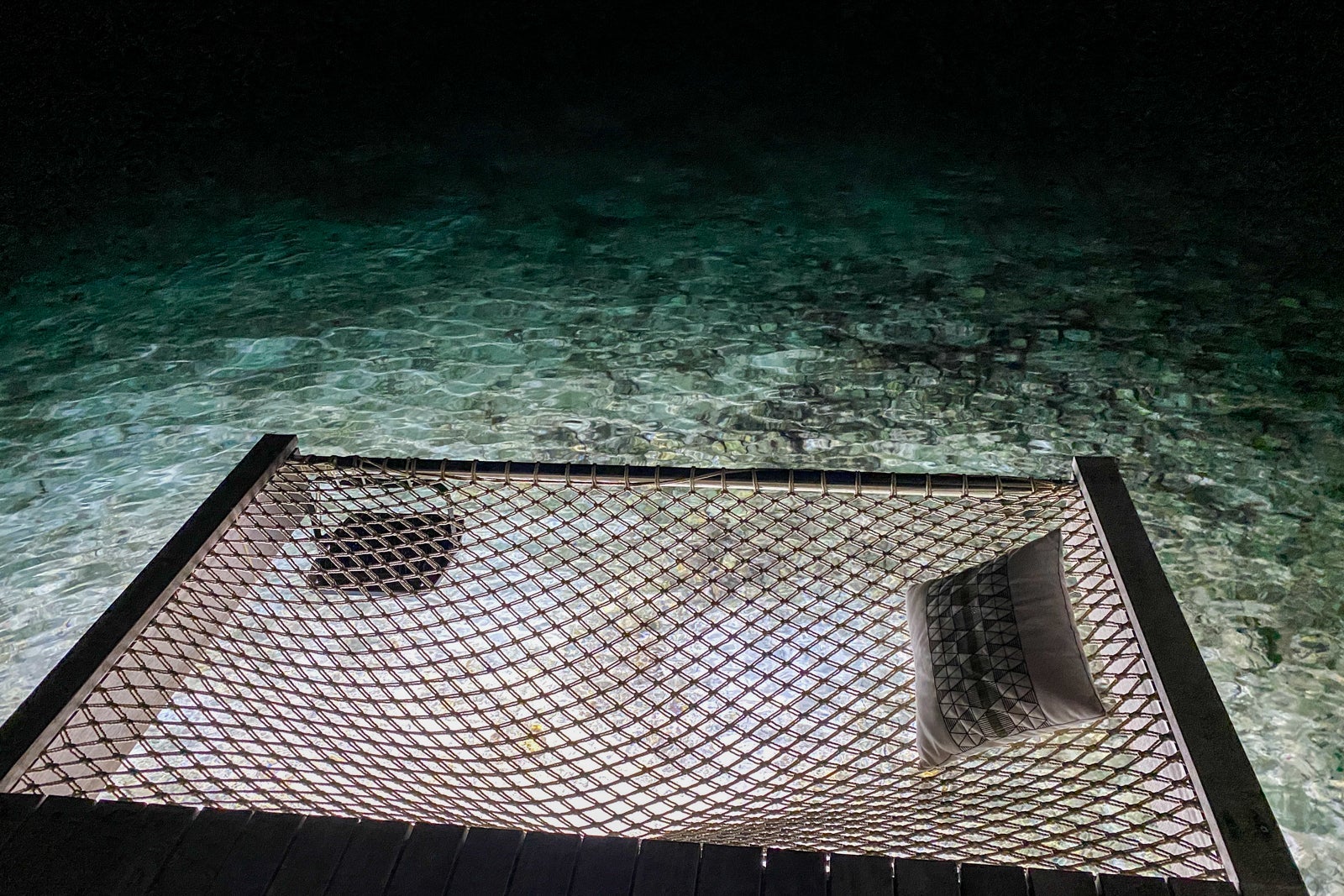 On my first night at the Ritz, I was curious as to whether I could see any sea life in the dark. I asked my aris meeha whether there was an outdoor light near the catamaran net below the villa. Unfortunately, there wasn't.