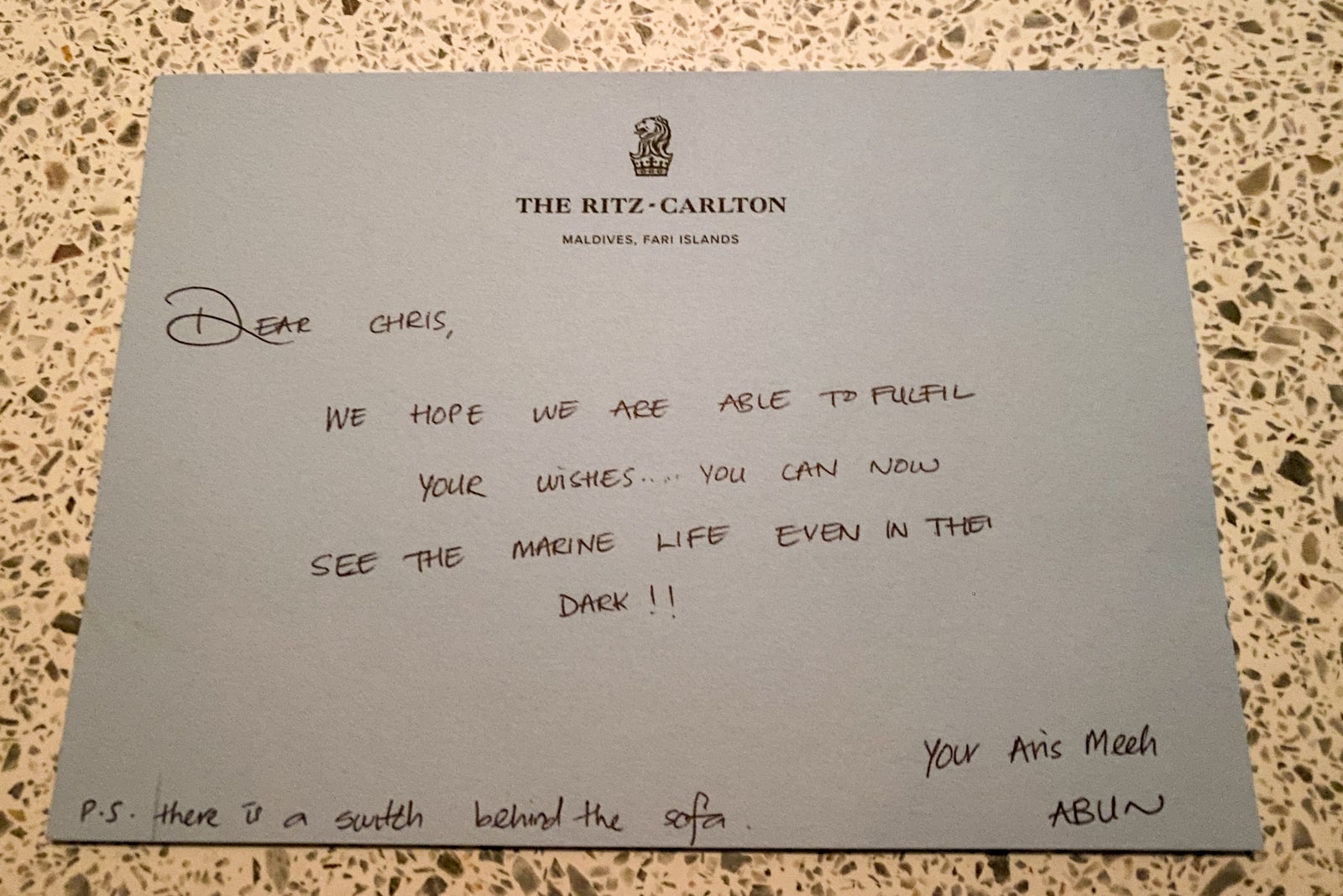 The Maldives are renowned for hospitality. And the Ritz is no exception. Take this one example as a representation of the service I received throughout my stay.
