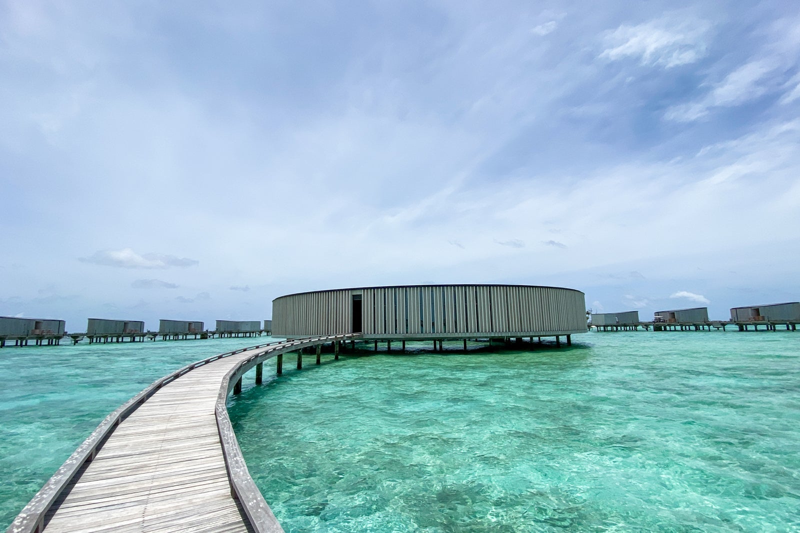 The iconic boardwalk-style circular path leads to the main neighborhood of overwater villas. At the center is the gorgeous ring-shaped spa.