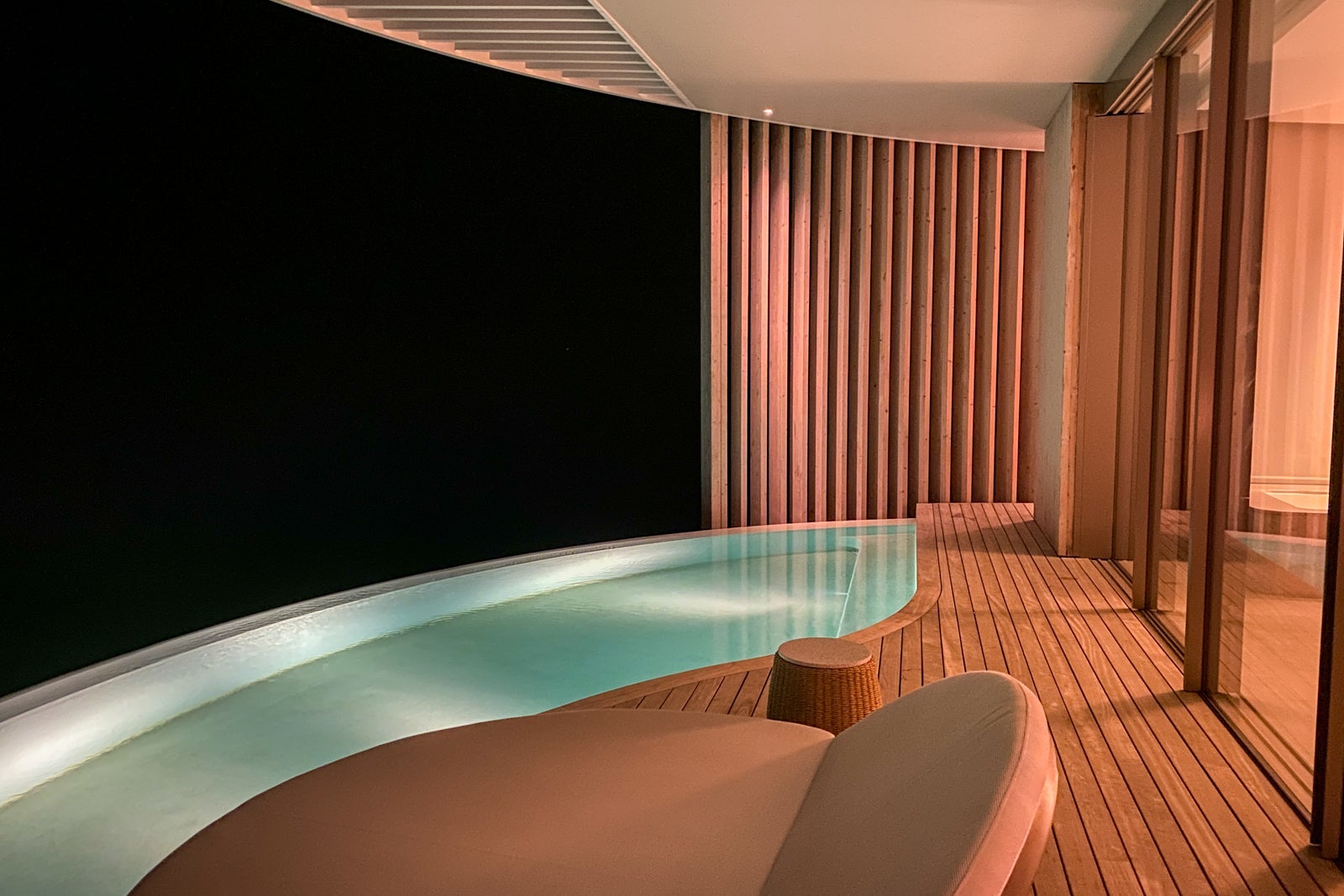 Each villa has its own pool that overlooks the ocean, and it's breathtaking. Next to the pool are a chaise lounger and more seating.