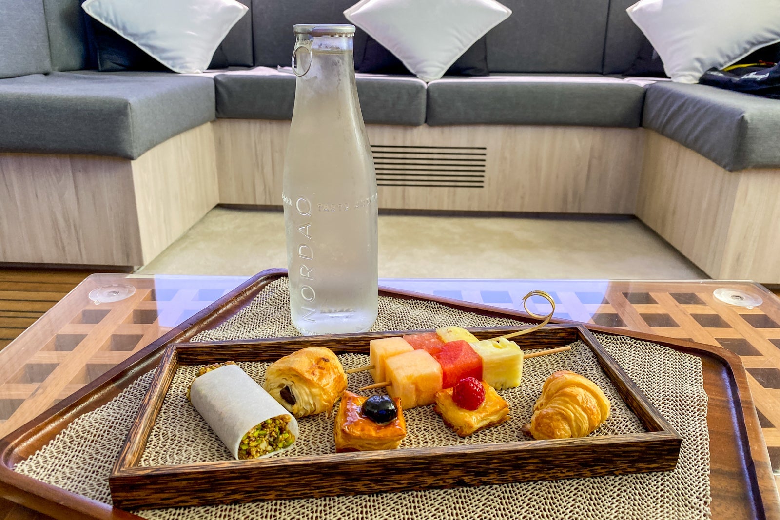 The interior of the ferry was clearly custom-built, outfitted in beige and gray tones with tinted windows and sumptuous seating. Once we jetted off, I was offered water, Champagne and a few sweets -- all of which were delicious and hit the spot after a long travel day.