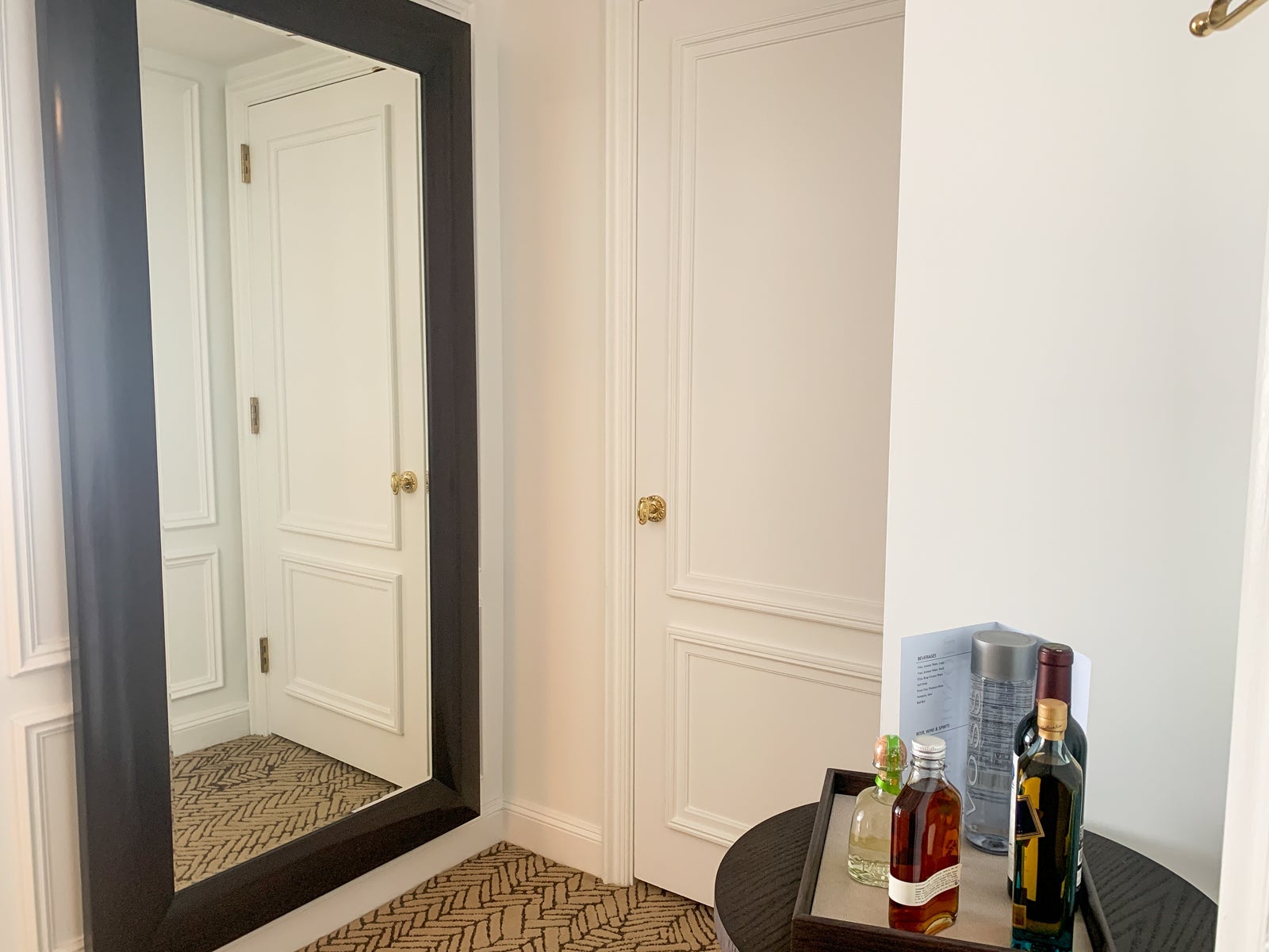 Right inside the entry door, there was a small foyer with a full-length mirror and a closet. Inside, I found the usual suspects, like a safe, iron and board, robe and slippers.