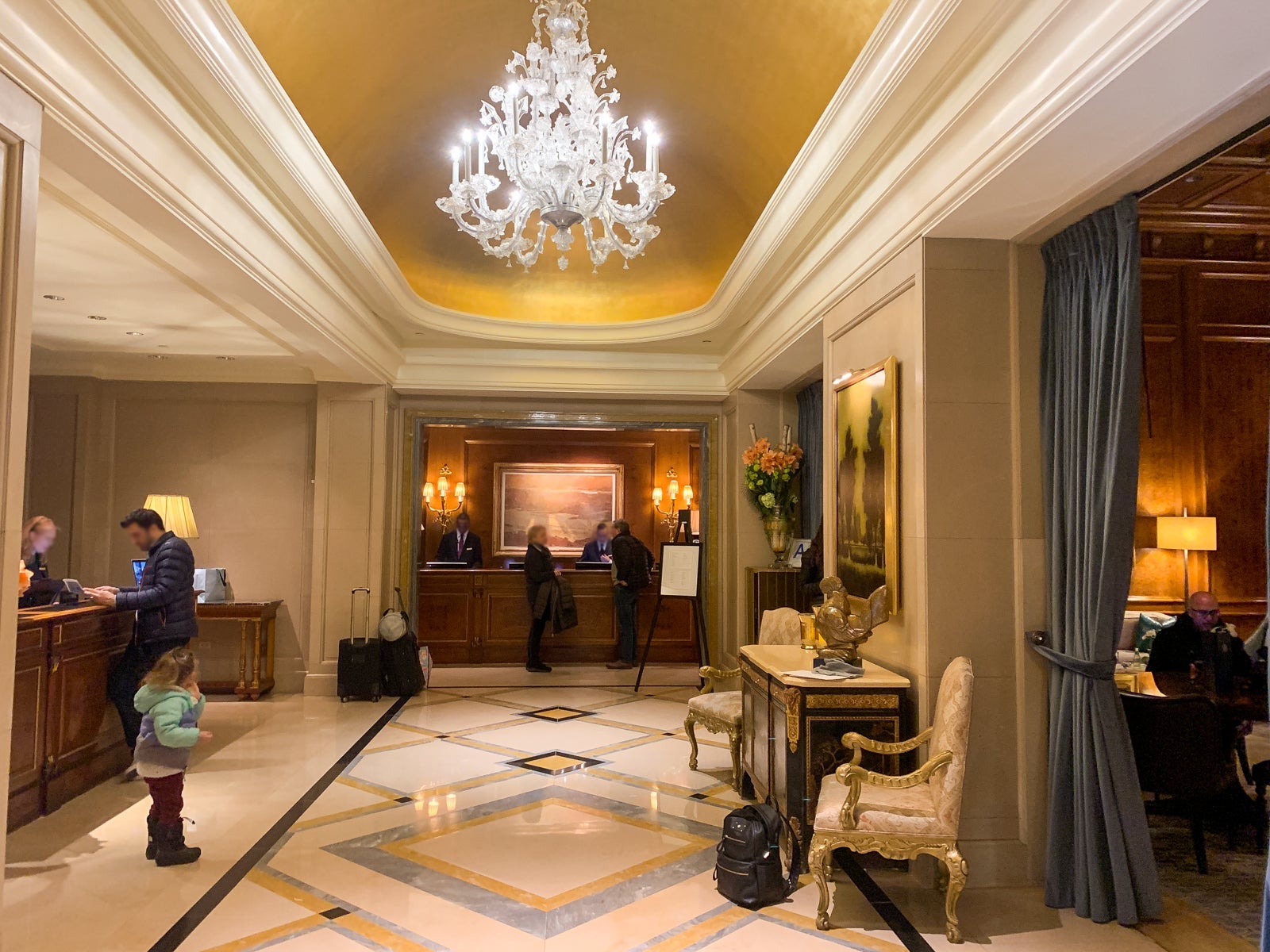 The lobby itself, though, was gorgeous. Small but elegant, it gave off a very old-New York vibe, with its gold-plated vaulted ceiling, ornate hanging chandelier, shiny marble floors and large, intricate crown moldings.