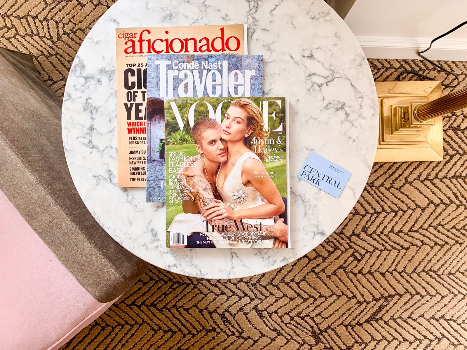I parked it on the chair in the small seating area to read all about Justin Bieber's wedding to Hailey Baldwin (JK, I really was reading about planes on my phone, of course). At any rate, the magazines left on the marble-topped table were yet another touch that contributed to the homey feel of the room.