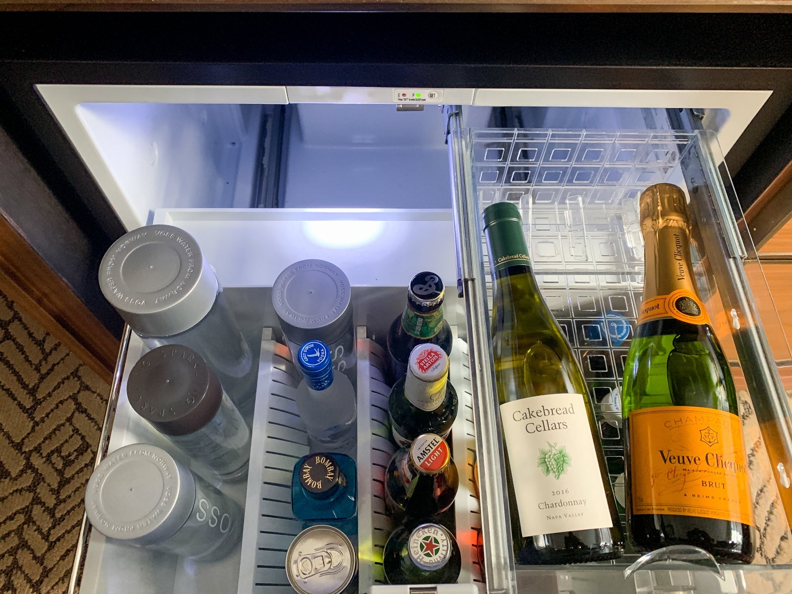 Half of the room's minibar was on a side table in the entrance foyer, but at $60 for the baby bottle of Patrón tequila, I was not going anywhere near that. The rest of the minibar could be found in the slide-out fridge in the dresser under the TV.