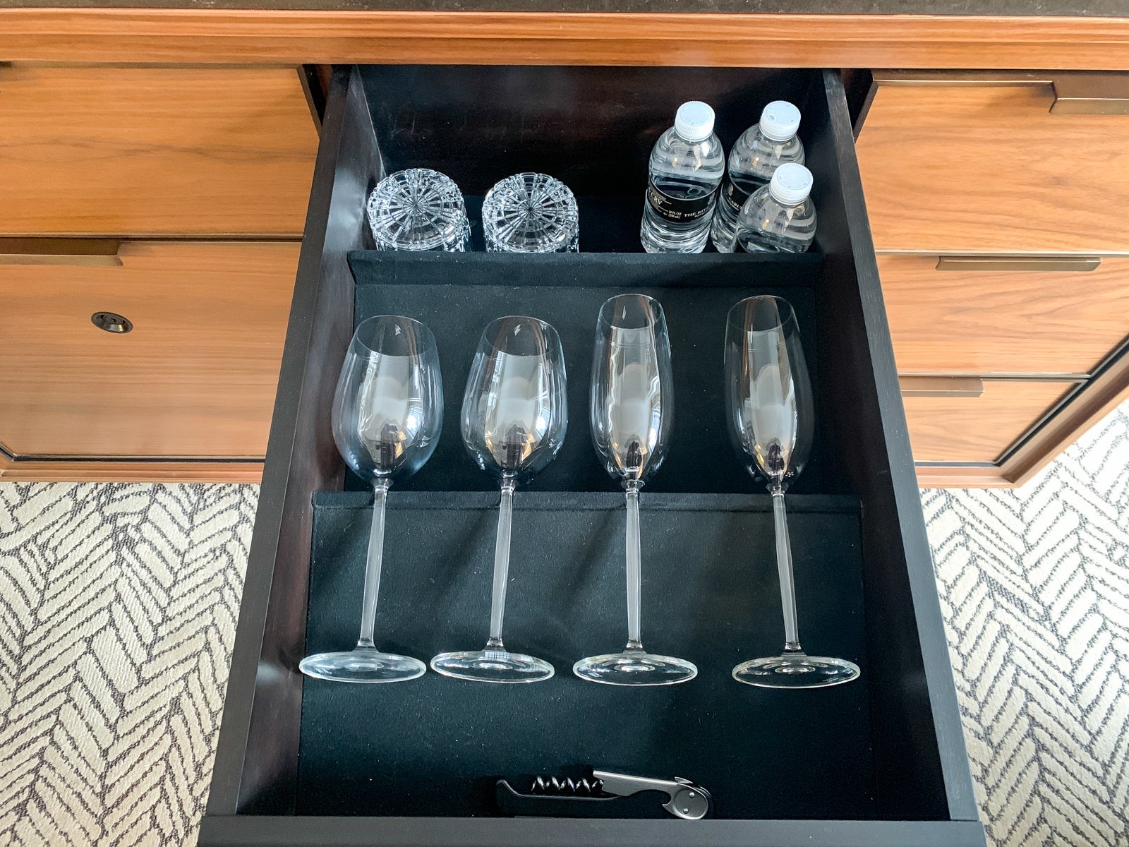 The hotel provided two wine glasses, two Champagne flutes and two rocks glasses — just like you'd have at your bar at home. I would have loved to mix myself a cocktail and sip it on the comfortable chair, "Mad Men" style, but with the prices of the booze in the room, I stuck to the free water bottles (which were replaced often and generously, by the way).