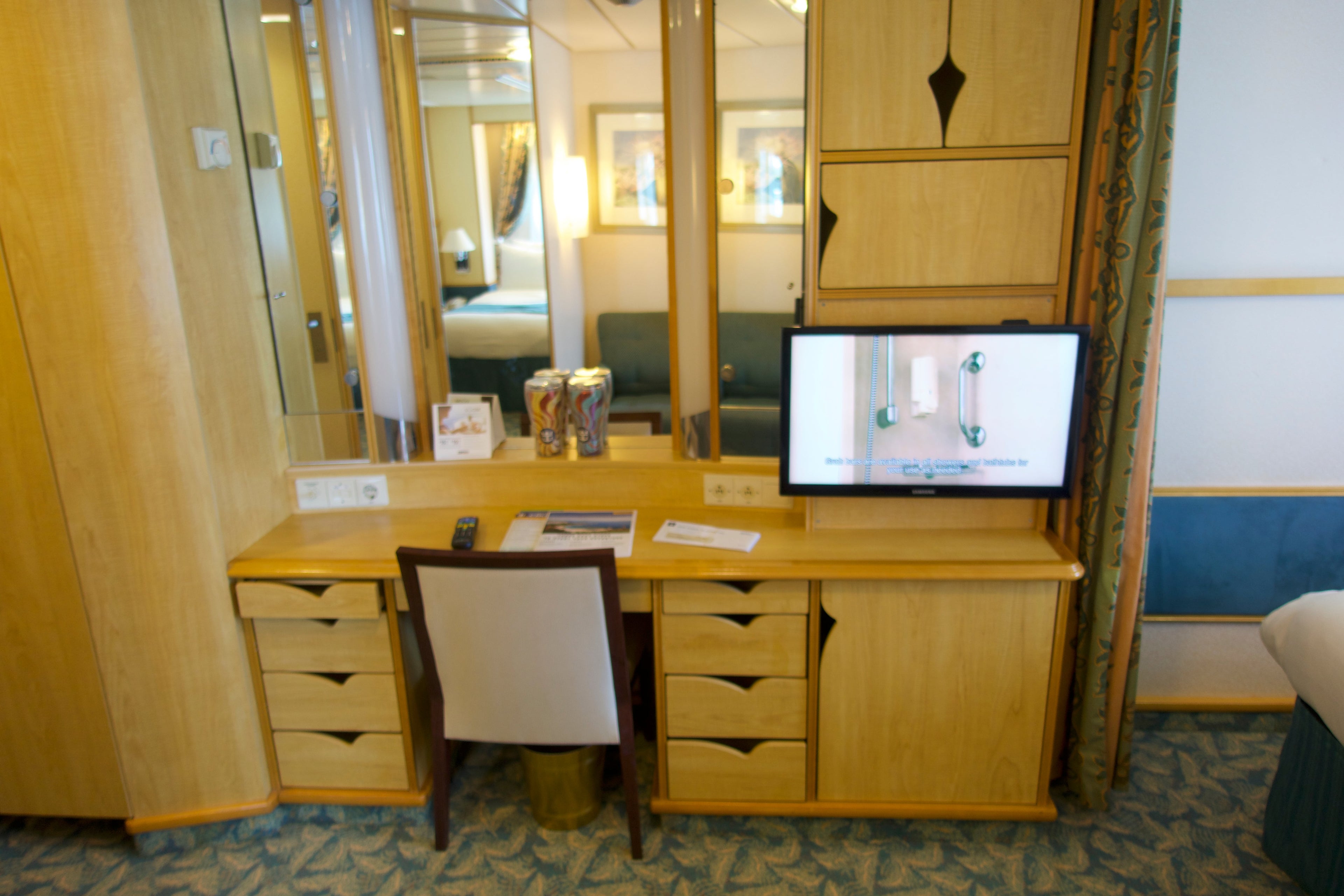 The vanity had eight small drawers, a mini-fridge and a couple of cabinets. There were also two panel lights on the vanity mirror. The TV was on a mount that allowed it to turn toward the bed.