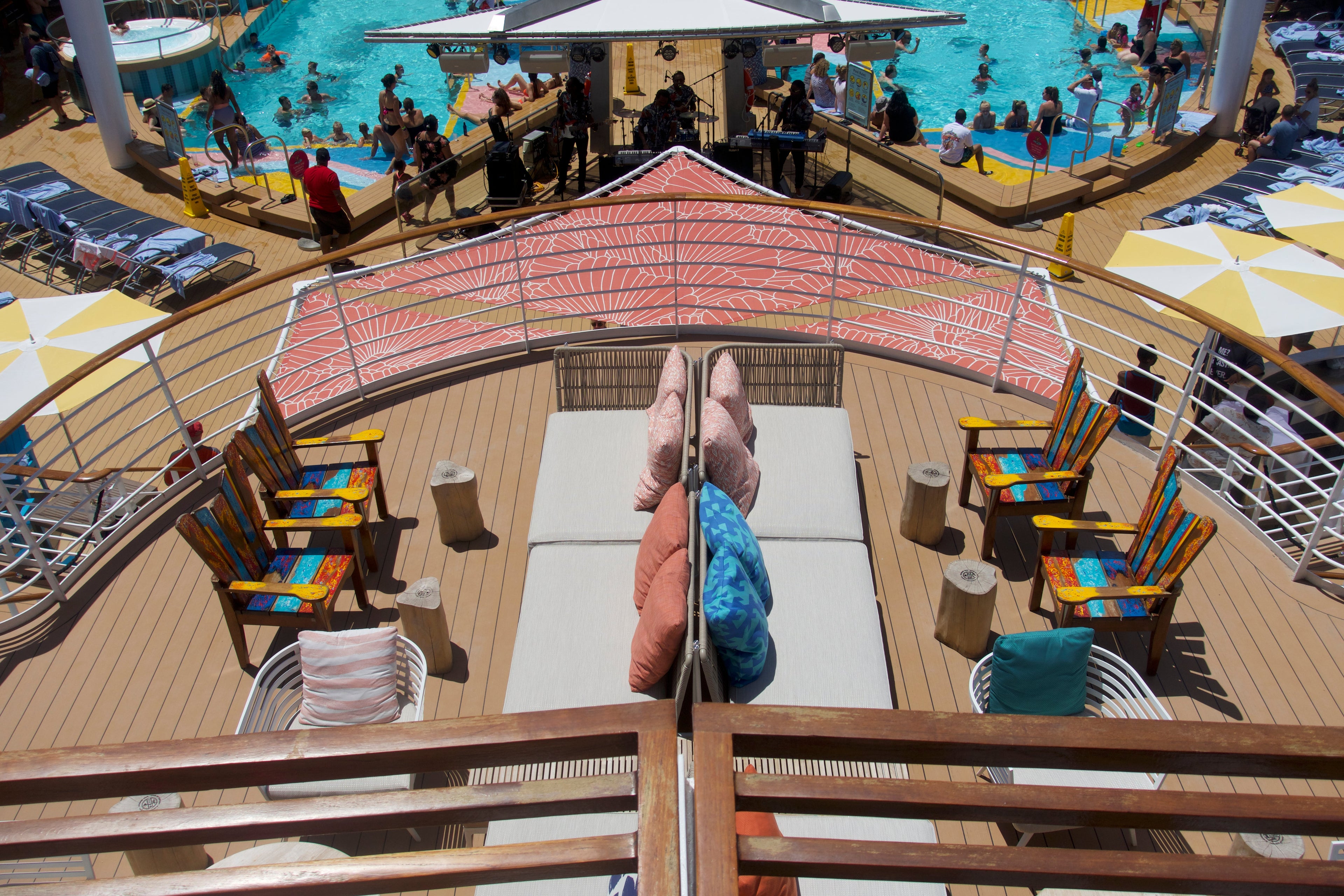There were two big pools in the area. The one on the left was a bit bigger, with two small hot tubs to the left of it. The pool on the right was smaller and had two large hot tubs right behind it with shades. Up front was a venue for live music, where steel drums welcomed cruisers on day one.