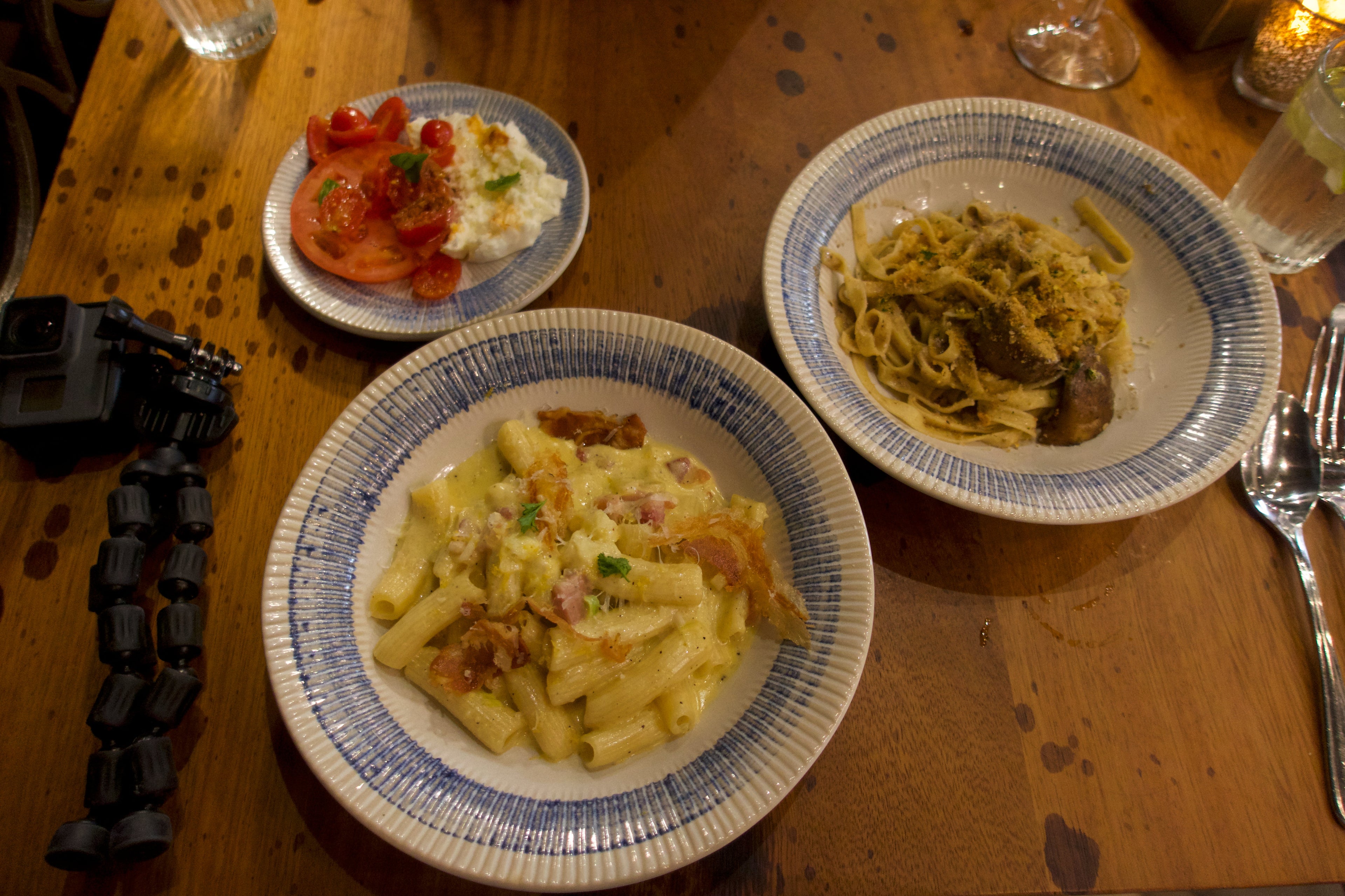 For the main course, the waiter offered to give me small portions of two pastas when I had a hard time picking between the two. One was a classic carbonara, the other was a full-flavored mushroom pasta. Both were delicious, and it showed that the pasta was made in-house on board. The meal also came with a side, so I chose a caprese salad, which hit the spot.