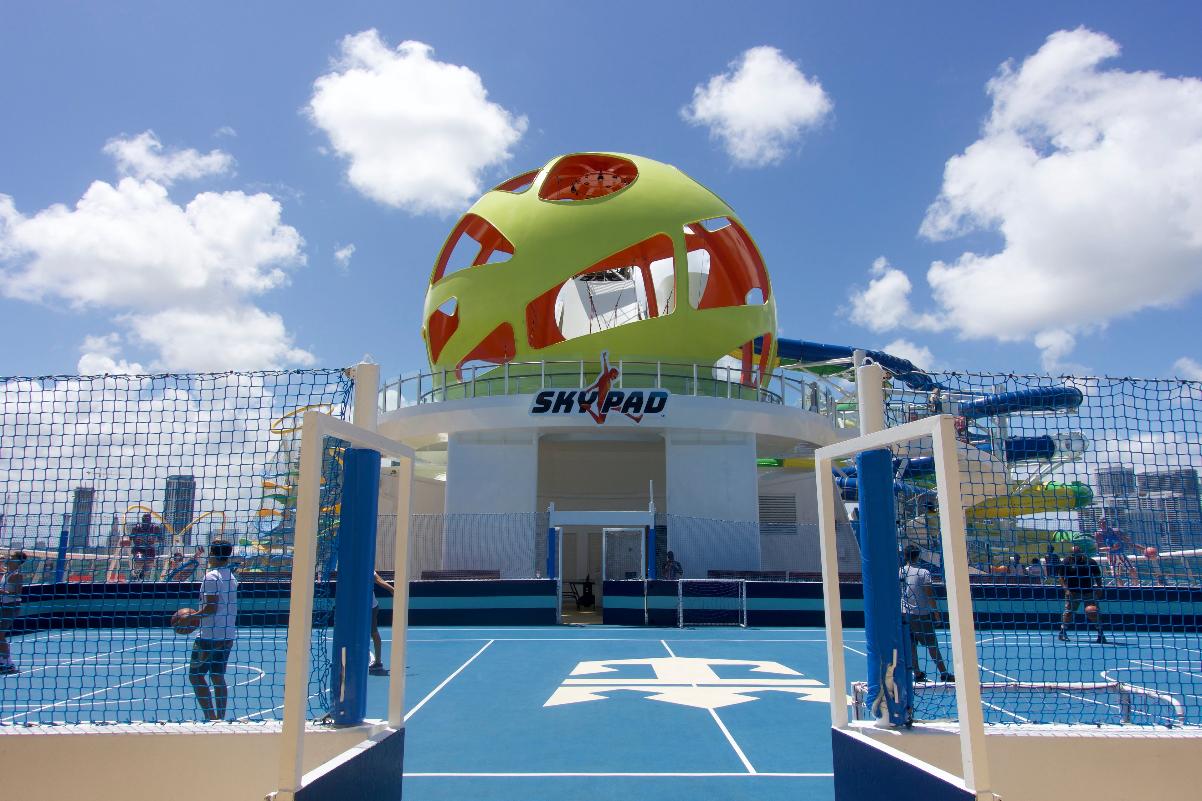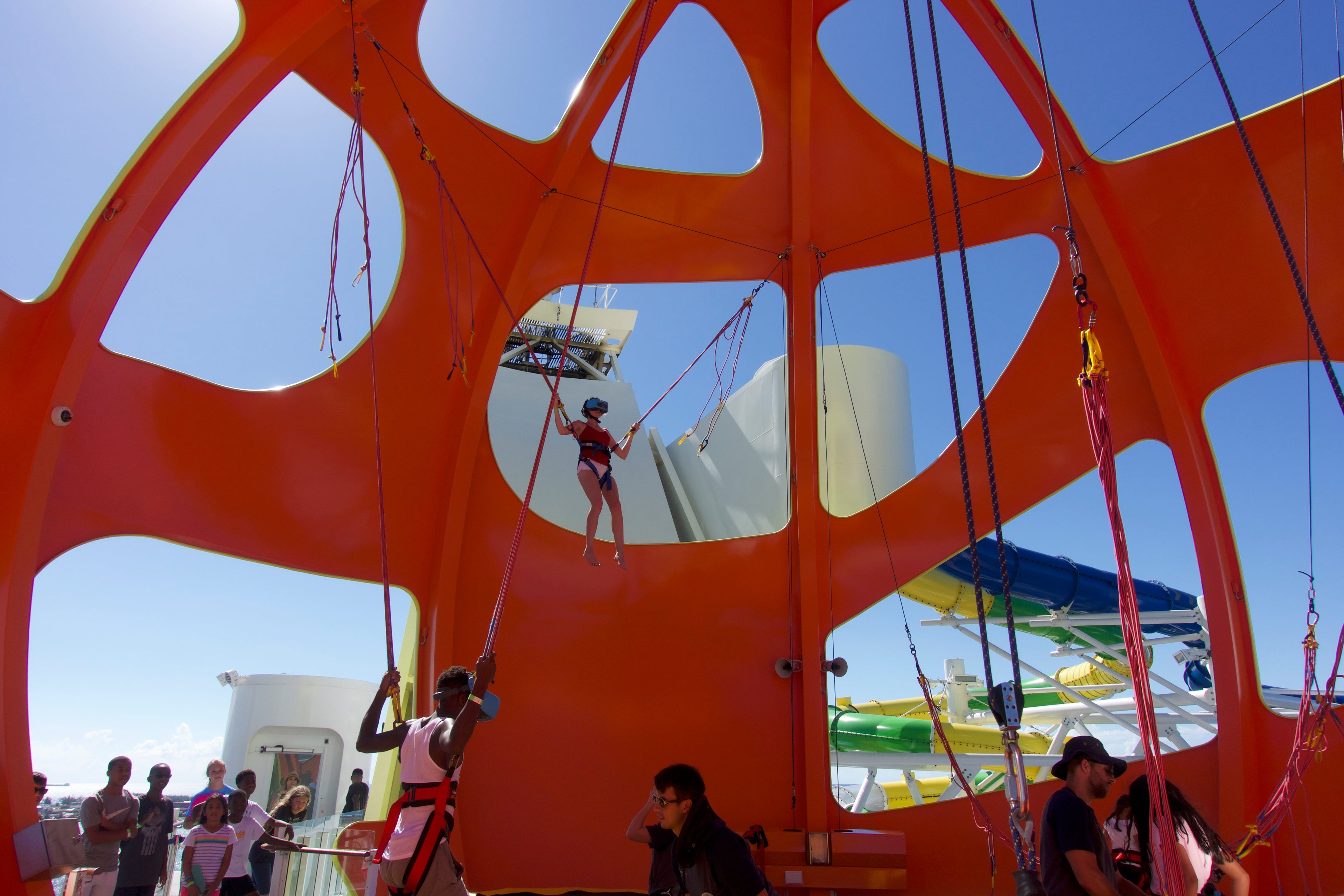 The Mariner of the Seas had an addition that I was excited to try: the Sky Pad. Behind the slides and Flowrider, a yellow-orange orb-like structure held four trampolines and bungee cords. Ages 5 and up were allowed to jump, and ages 7 and up were allowed to experience the bungeeing via a virtual-reality headset. Naturally, I had to test it out.