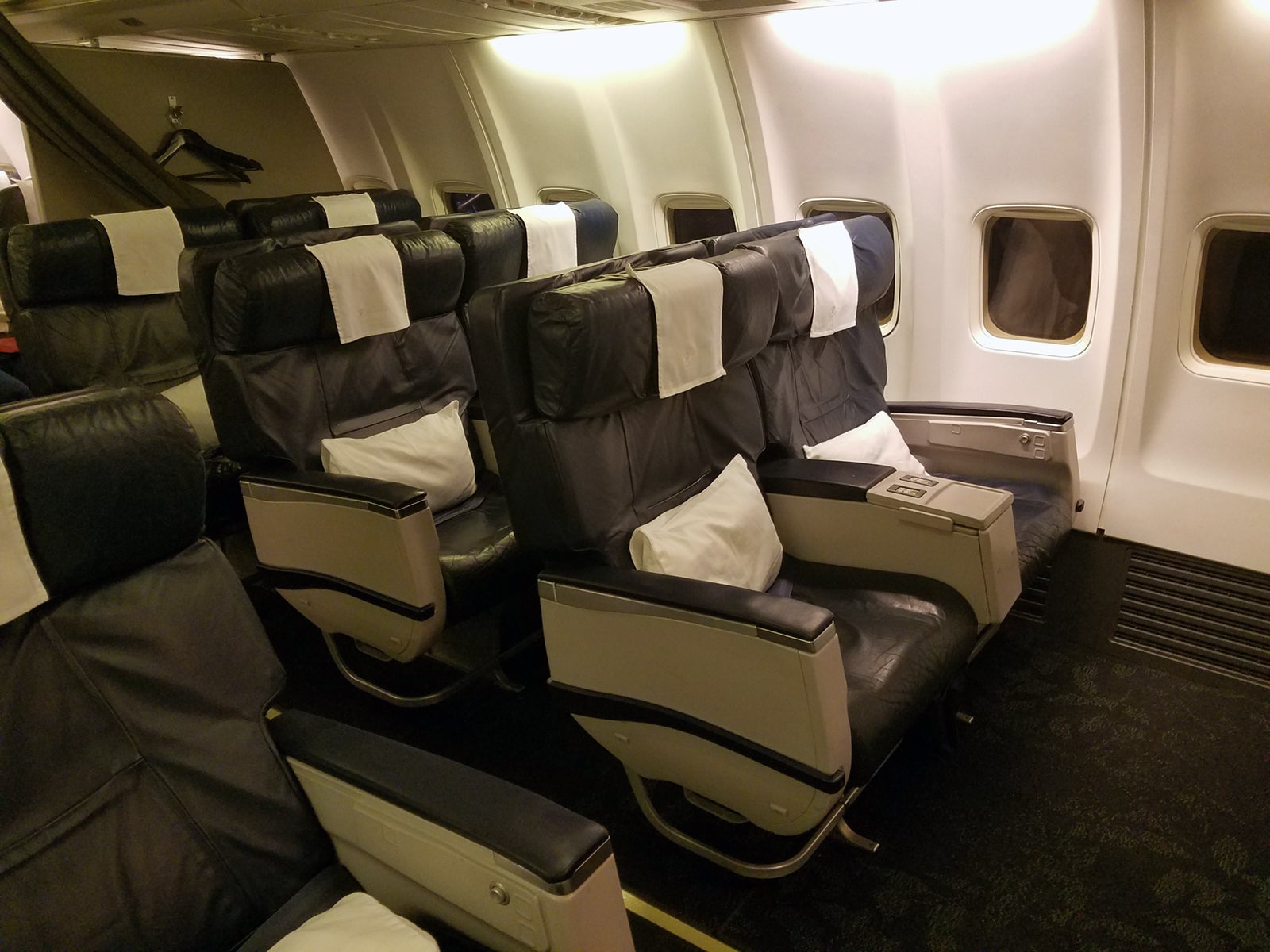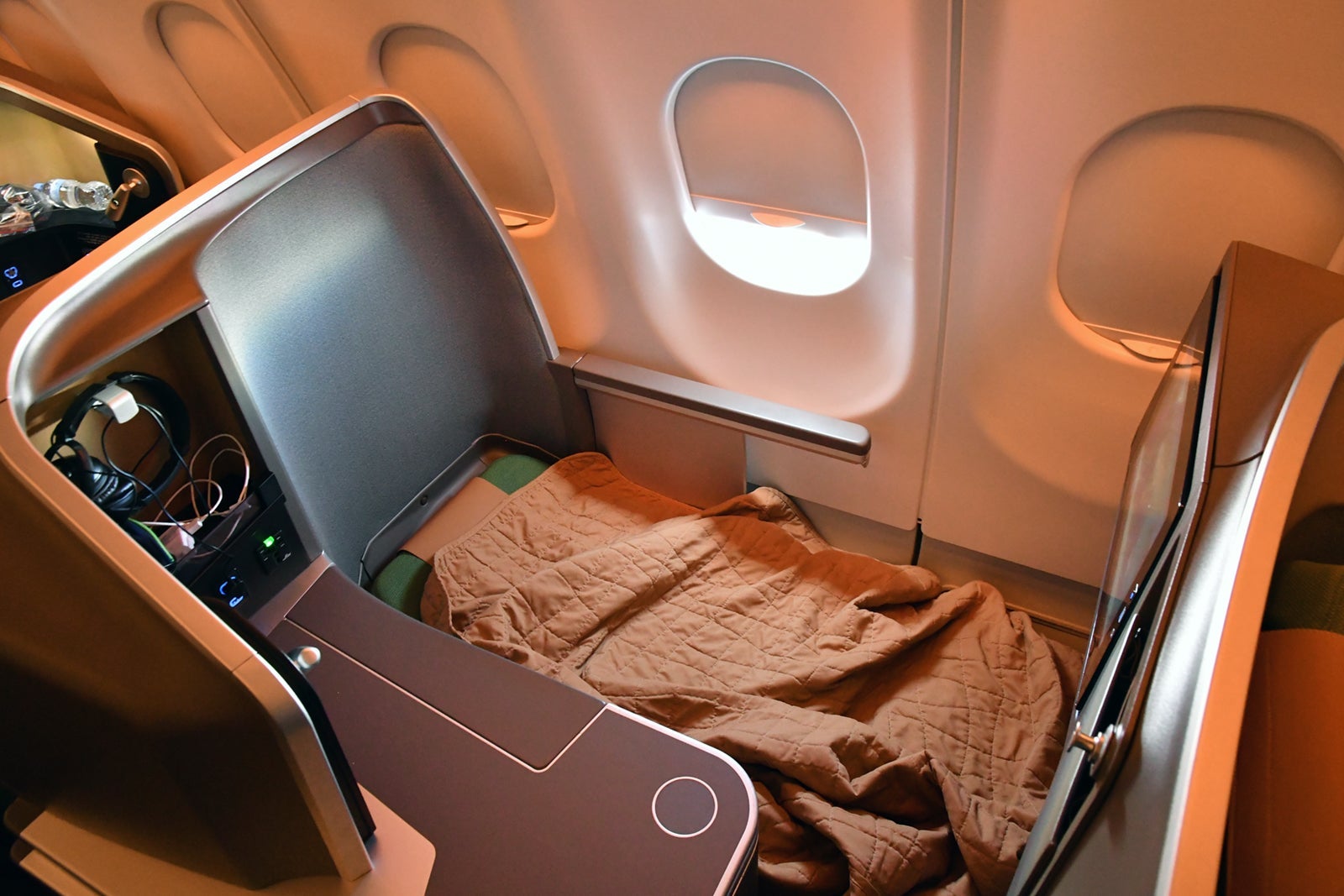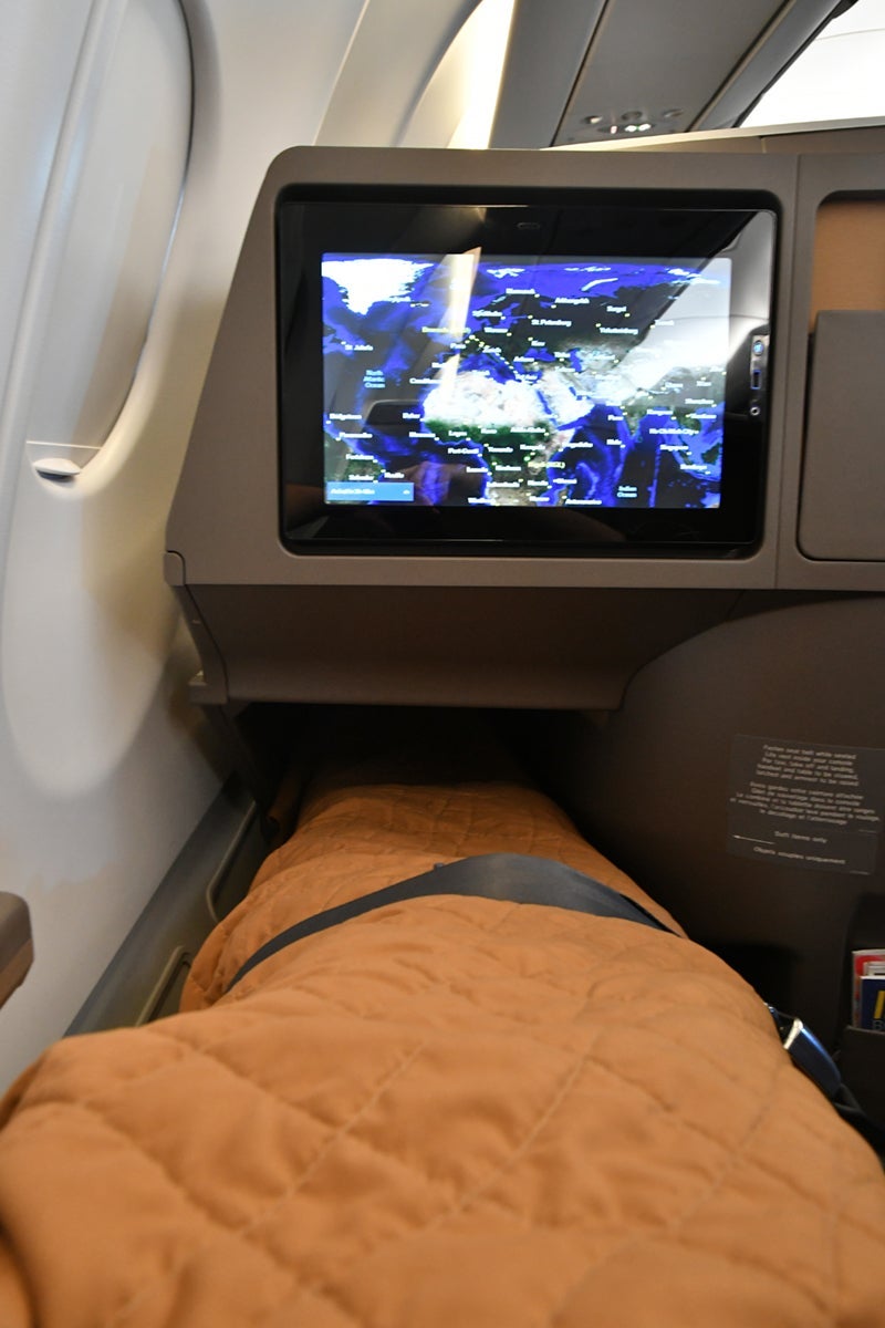 In the flat-bed position, the seat was plenty long enough for me, with a warm cozy blanket — the cabin may have been a little too warm for the average American used to strong air conditioning, in fact — and a too-flimsy pillow. I grabbed another one from a nearby empty seat, and even then could have used more head support. I still slept a couple hours pretty solidly.