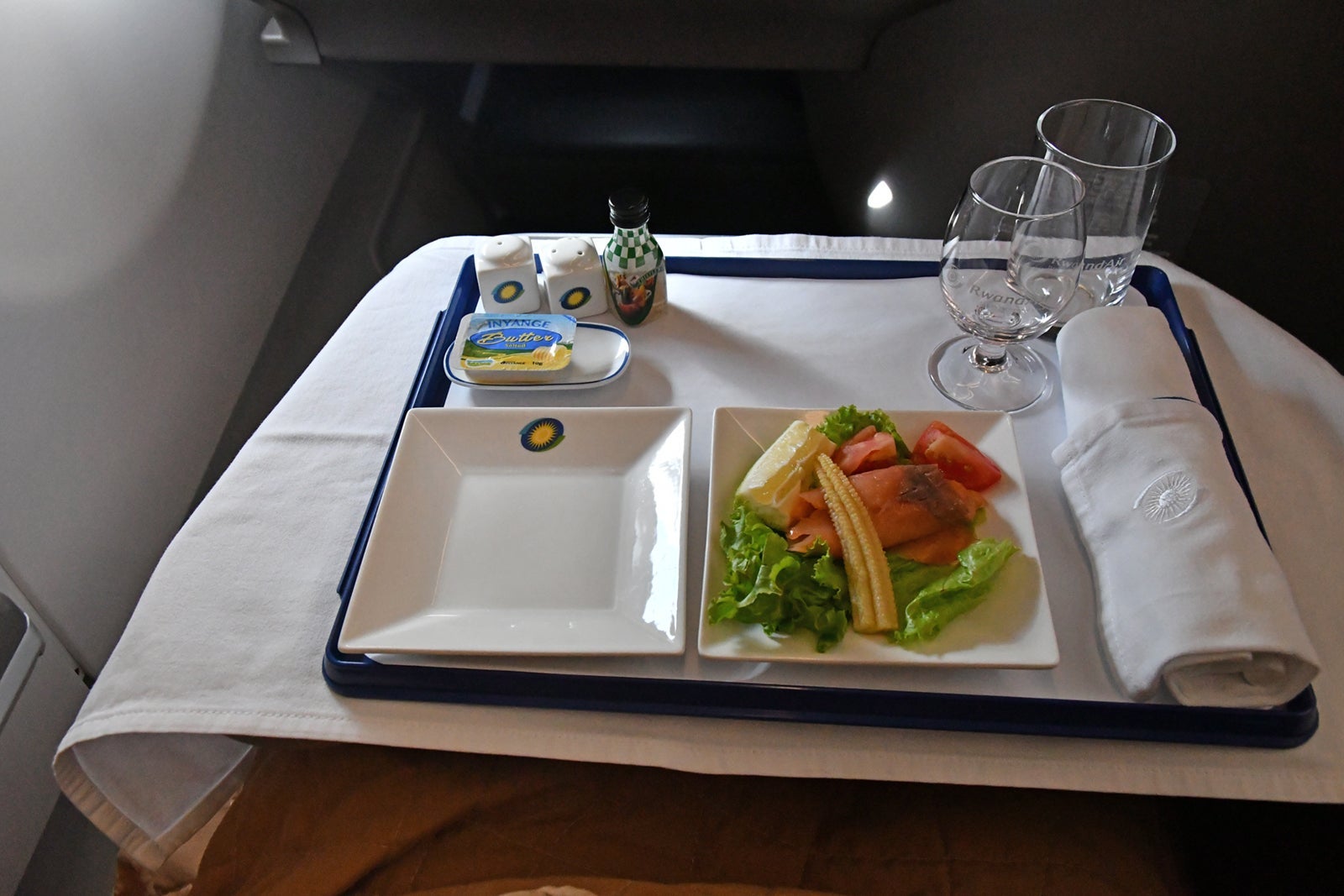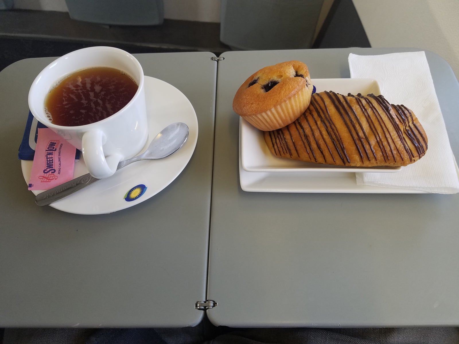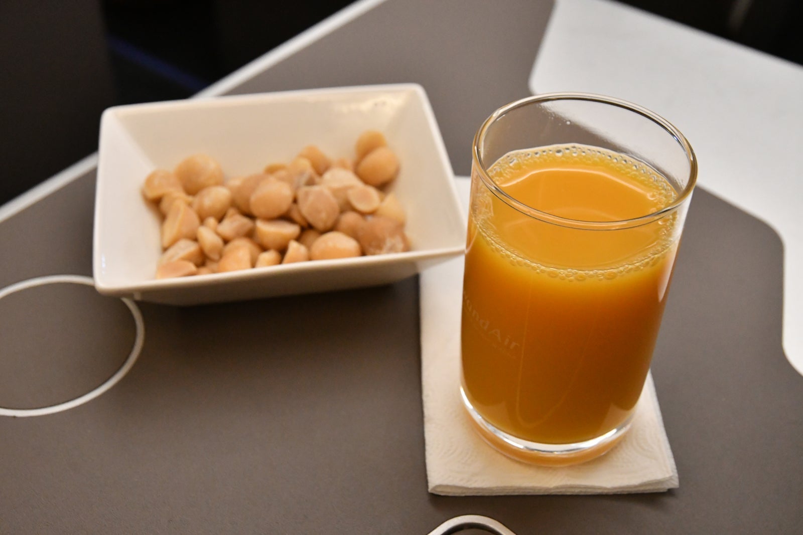 Three hours later, as lunchtime approached after my post-breakfast nap, a full beverage cart appeared, but the migraine pill I had taken earlier meant avoiding alcohol. I instead had an orange juice with an appetizer of nuts that would have benefited greatly from a quick warmup in the oven.