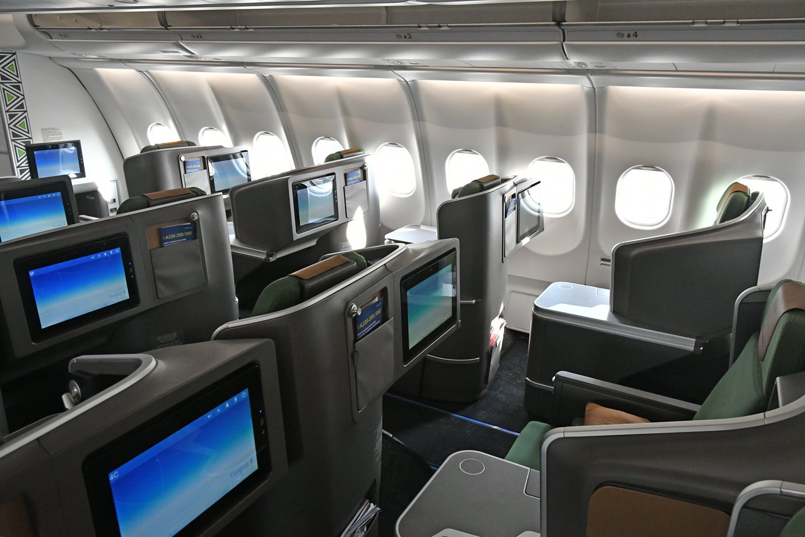 Both RwandAir Airbuses were arranged in a three-class layout with business, premium economy and economy. The bigger 300 featured 30 biz seats, 21 in premium economy, configured 2-3-2, and 223 in economy, configured 2-4-2. On the A330-200, you'd find the same seats but smaller coach and business sections.