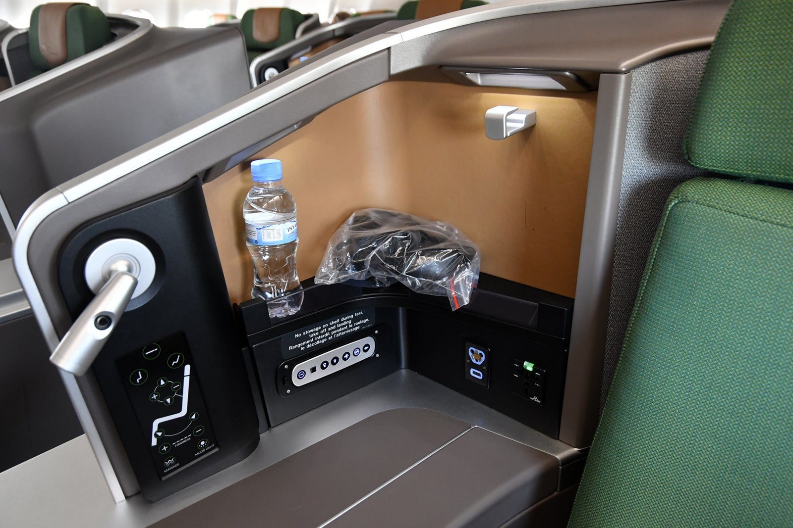 Traditional designs adorned the front of the cabin on the bulkheads, another class touch. My seat offered a lot of space, with just one drawback in terms of the hard product: limited storage at the seat, with no enclosed space for small objects. The ledge where I found headphones and a water bottle was a good place for my phone and other pocket things, but I would have liked a cubby for my laptop. An international power outlet and powered USB connection were below the storage ledge.