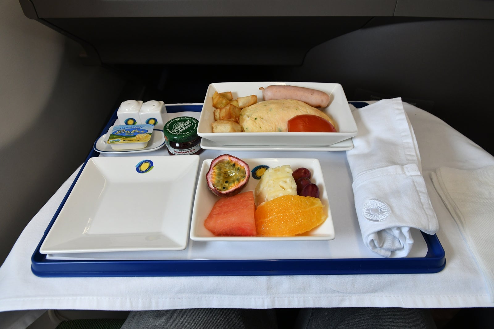 Shortly after boarding, a flight attendant came down the aisle with a tray of glasses with orange juice and water. After a smooth takeoff and climb to cruising altitude, another round of juices appeared, followed by the breakfast cart, with no menu. The choice between the two main dishes was presented simply as "plain omelet or with ham?"