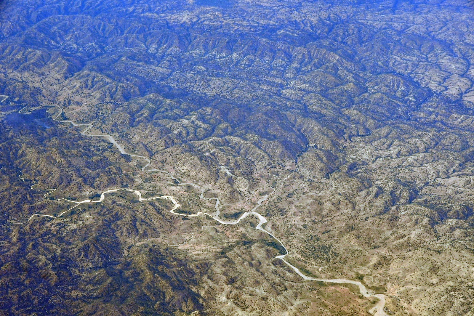 ... to the stark landscape of Sudan, with sparse traces of human habitation.