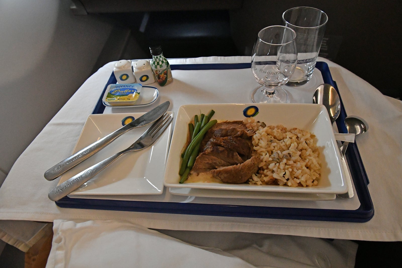 At 1:20pm Kigali time, one hour ahead of Brussels, lunch was served from a cart, again with no menu. The smoked salmon appetizer — there wasn't a choice — was the culinary highlight of the whole flight. I'd have gladly eaten a couple more servings. The entree was a choice between beef, rice and beans or fish. This was by no means a presentation on par with the best international biz-class standards. The beef was stringy and on the chewy side, too. Lunch, concluded by a fruit dessert, was not a success.