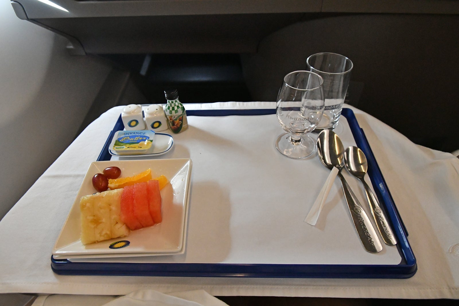 My choice, the ham, accompanied by a sausage and fries plus a slice of tomato, was pretty bland, as were the coffee and fruit plate. RwandAir wasn't starving me — I already had eaten quite a lot on the 737 from Nairobi — but wasn't serving me anything notable, either.