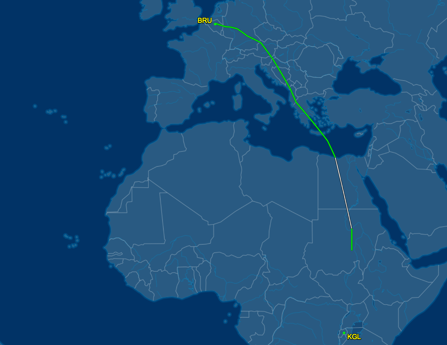 The projected route shown on the IFE map — which was not of the pinch-and-zoom kind, unfortunately — overflew Libya, the most direct course to Brussels, but that's not what we ended up doing. Libya is a conflict zone, and most airlines avoid it. Our captain told us we would overfly Egypt, and that's what we did, as the route map from flight-tracking site FlightAware later showed. (The first two hours or so were not tracked.)