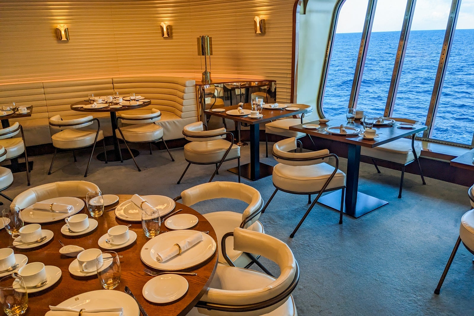 The Wake also serves brunch and lunch, but I wouldn't recommend it for breakfast. The menu is tiny and fancy, mostly variants of eggs Benedict, a decadent brioche French toast, steak and eggs and a vegan dish. No fruit, no bacon, no oats. The waiter came around with a tray of off-menu pastries halfway through our meal, rather than when he served our coffee and tea. In addition, the restaurant's position low on the ship and above the engines means you feel and hear the vibration of the ship a lot and all the cups and saucers were rattling.