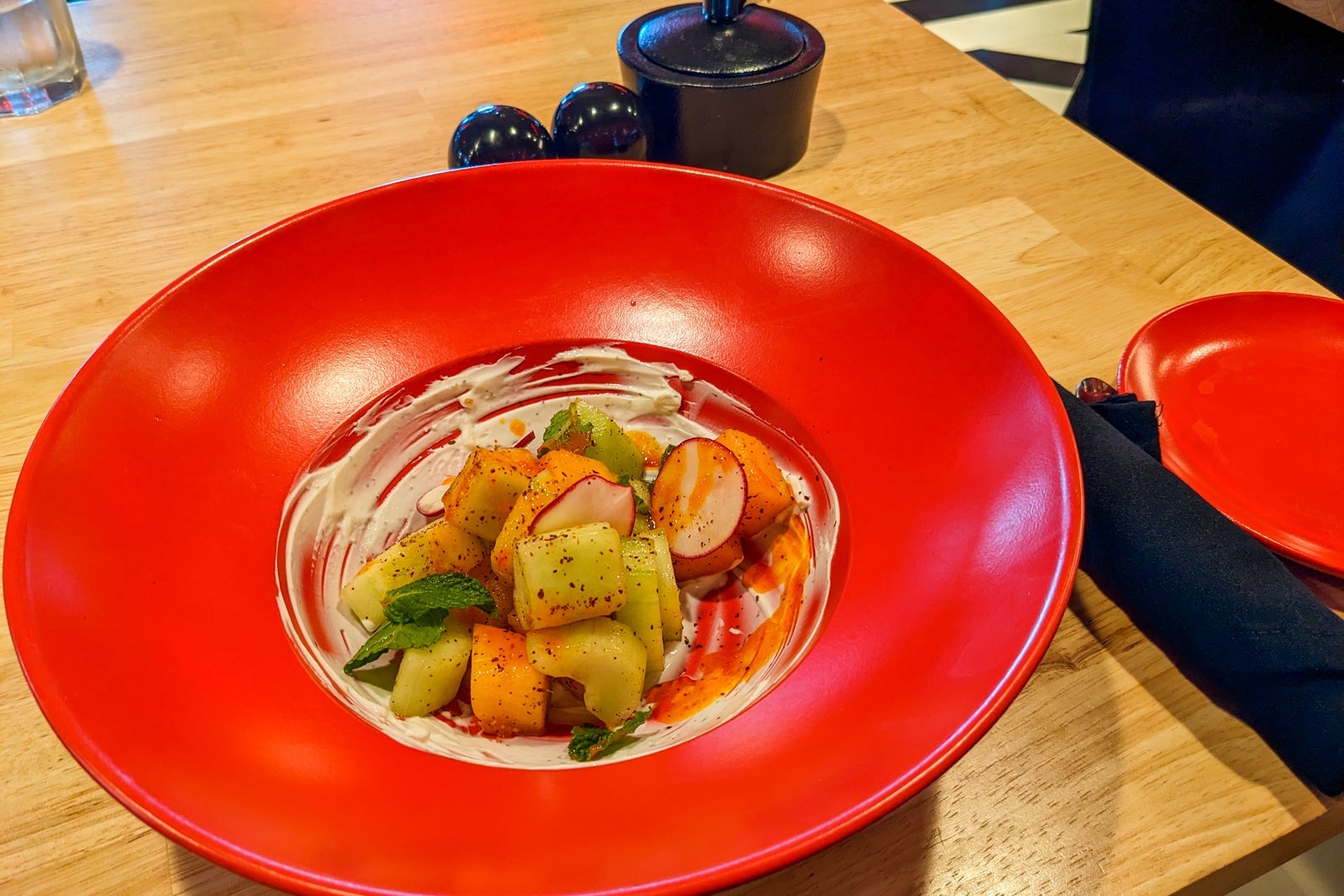 Razzle Dazzle is a vegetarian-forward restaurant (with several, no-longer-secret meat entrees) open for brunch and dinner. At brunch, the spicy avocado toast gets high marks, and the cucumber-melon salad was a refreshing starter. Oddly, the restaurant had no jam for my British-style chocolate-chip scone and I had to make do with butter.