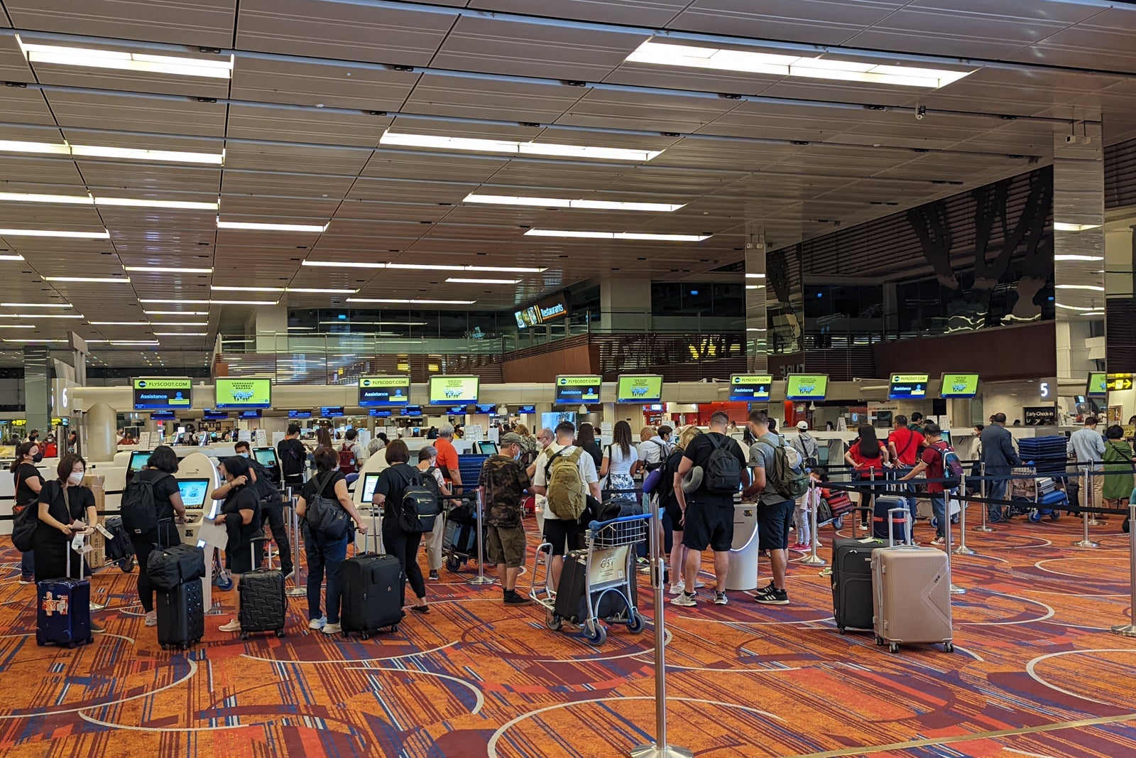 Scoot has a sizable check-in area set up at its home base, with all passengers funneled into a single queue to check in at kiosks and then drop their own bags onto the luggage belts.