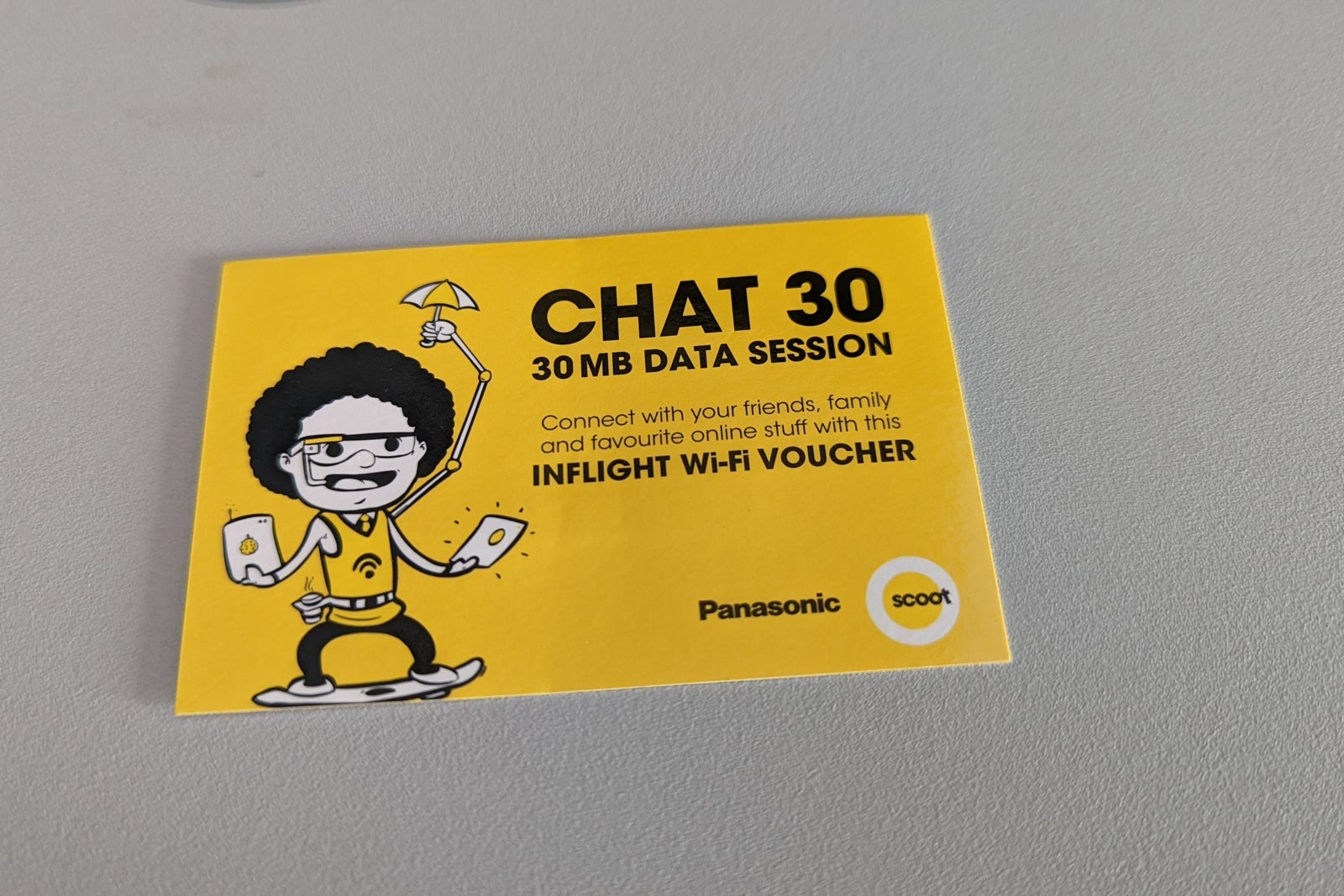 All ScootPlus passengers were handed a card with a code for their 30MB of complimentary Wi-Fi. Virtually every passenger struggled to connect, myself included, as the service was constantly displaying as "Connected, but not available right now" for several hours. I eventually managed to connect through a non-Chrome browser (try Safari), but the 30MB only lasted a few minutes.