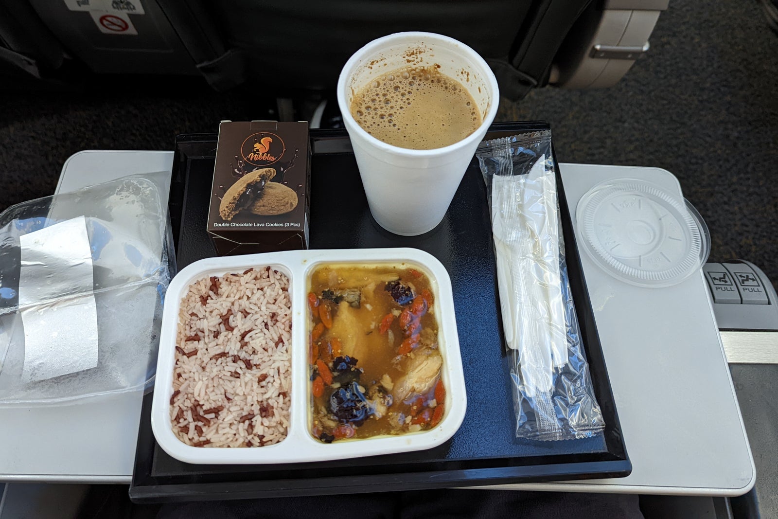 The chicken had some mystery black items floating in it but tasted OK, even if it was an odd choice for breakfast. I was also offered my choice of a cold or hot nonalcoholic drink. I chose the hazelnut white coffee, which was a powdered concoction, far heavier on sugar than coffee. There was also a box of chocolate cookies for dessert, again unusual for 8 a.m.