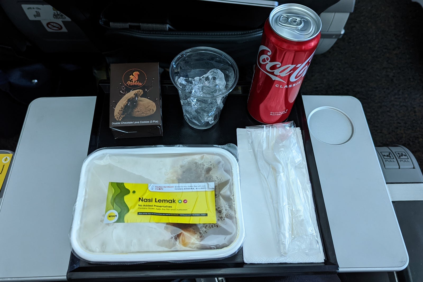 A sealed cup of water was waiting on each ScootPlus seat — I hadn't seen water served like that since I was a child and it reminded me of flying Singapore Airlines many decades ago.