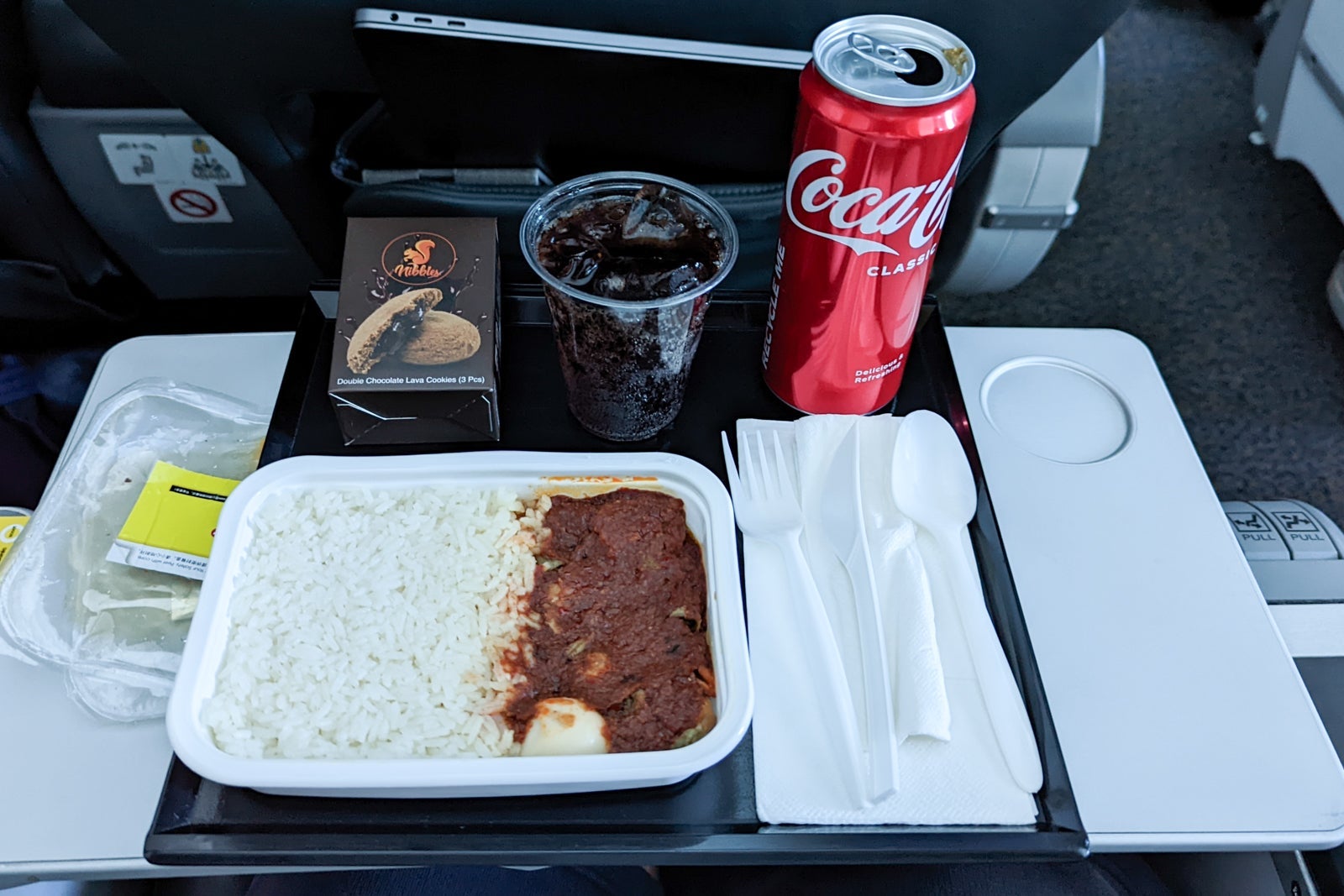 The crew relented and offered to serve passengers on demand. I chose to have my second meal around four hours into the flight, which consisted of a preordered nasi lemak, a typical Malaysian dish I had enjoyed on previous visits to Asia.